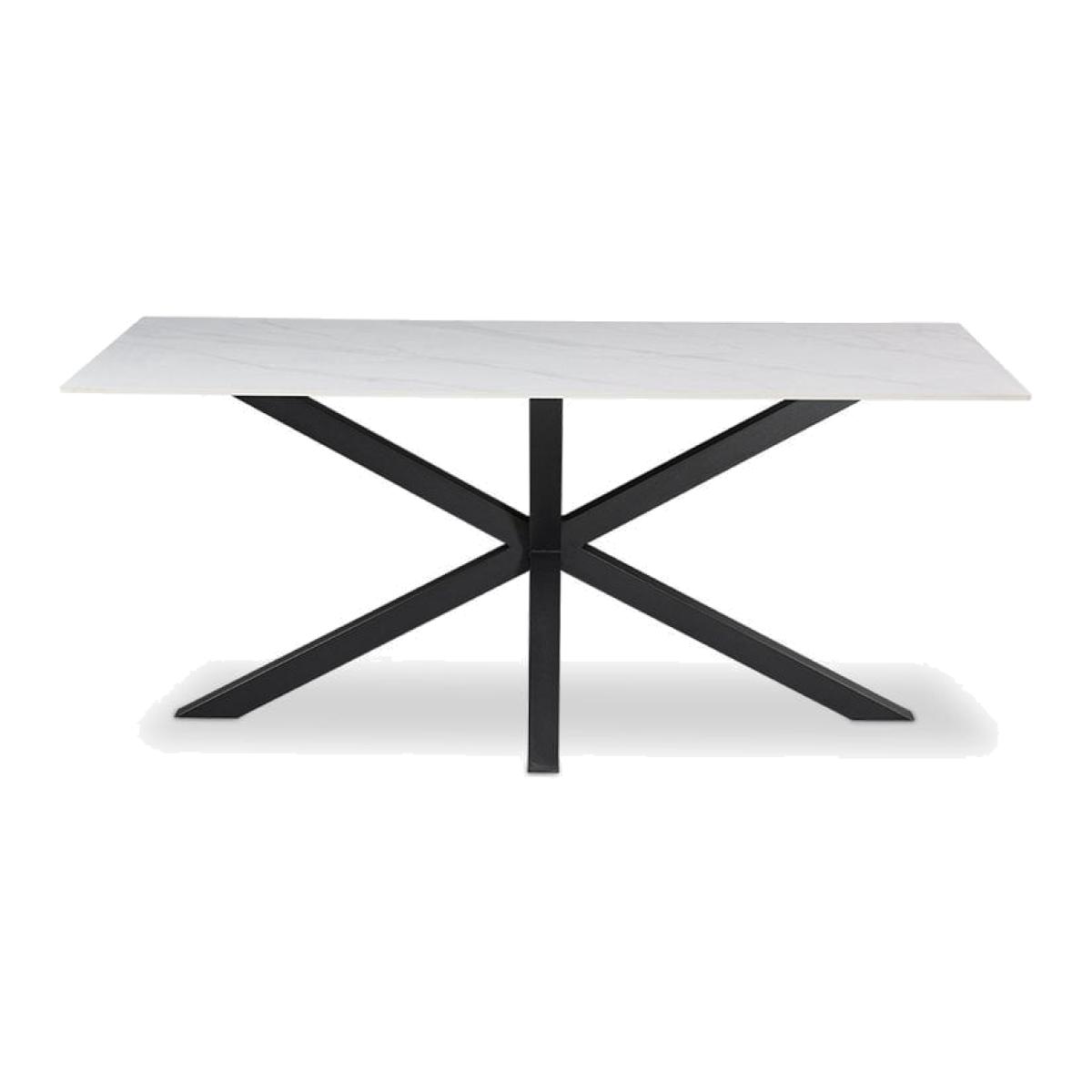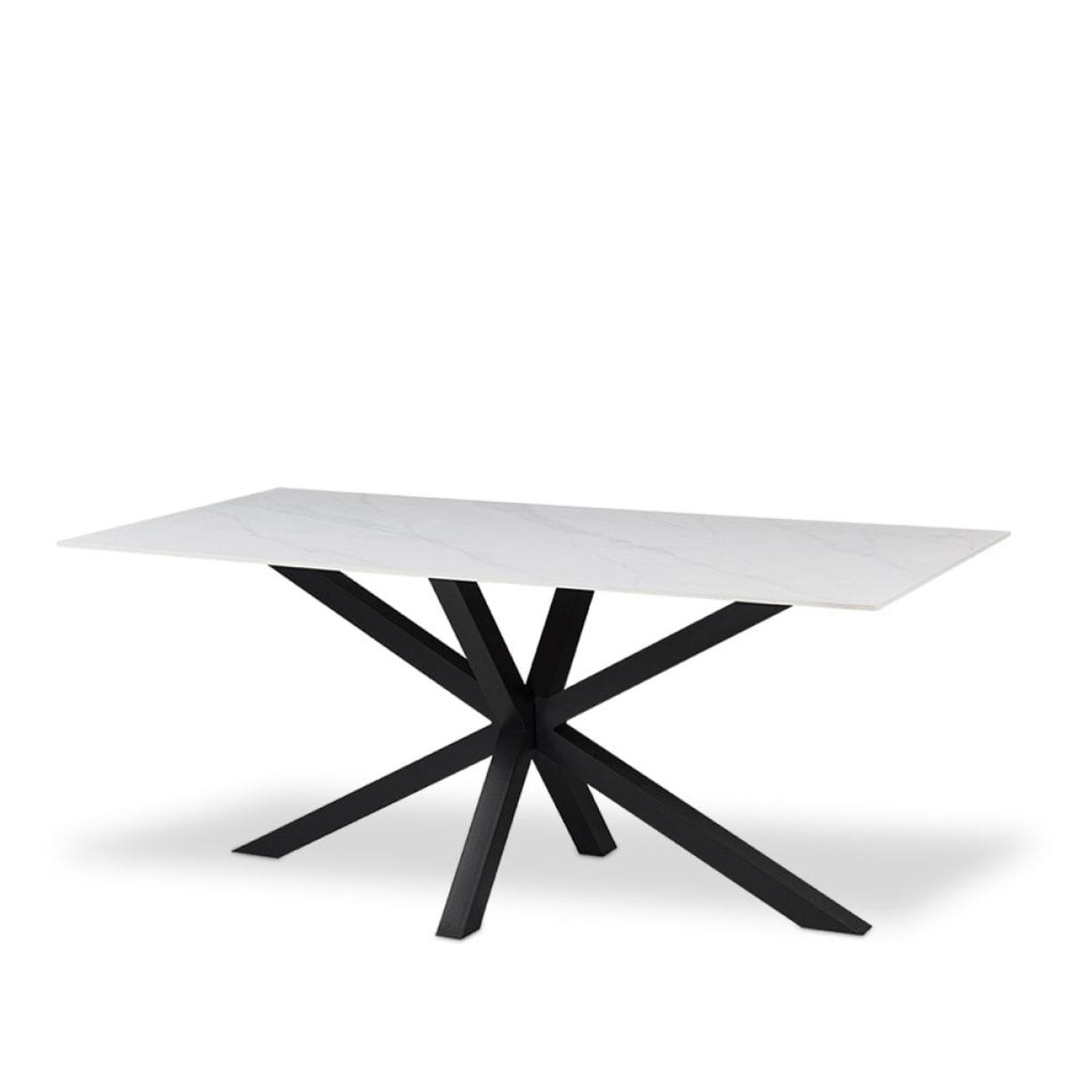 Comfortably sitting 6 people, the blend of raw materials mixes contemporary industrial design with everyday dining for a modern dining table built to last. The Sawyer Dining Table in White features sculptural starburst metal legs in black that offer stability and maximise legroom whilst the matte white surface is made from smooth and durable ceramic; low maintenance in a contemporary modern design.