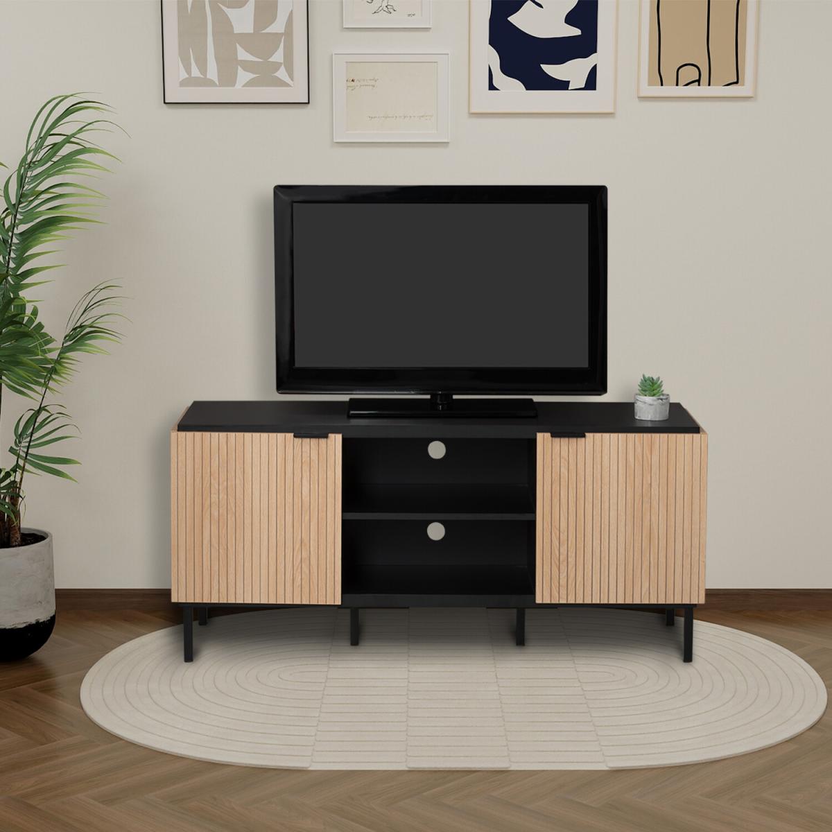 Designed to complement any existing living room environment, the Saxon 2-Door TV unit ensures your TV takes pride of place. Boasting two side doors, two practical storage shelves, and a stylish finish, this durable unit is perfect for those looking to accentuate their home with a touch of elegance and class. The black colour is modern and dynamic, but the wood panel-inspired accents help to give the TV stand a fresher, softer appearance. The stand also has two sections for cables, so behind your TV, it looks as good as the front!