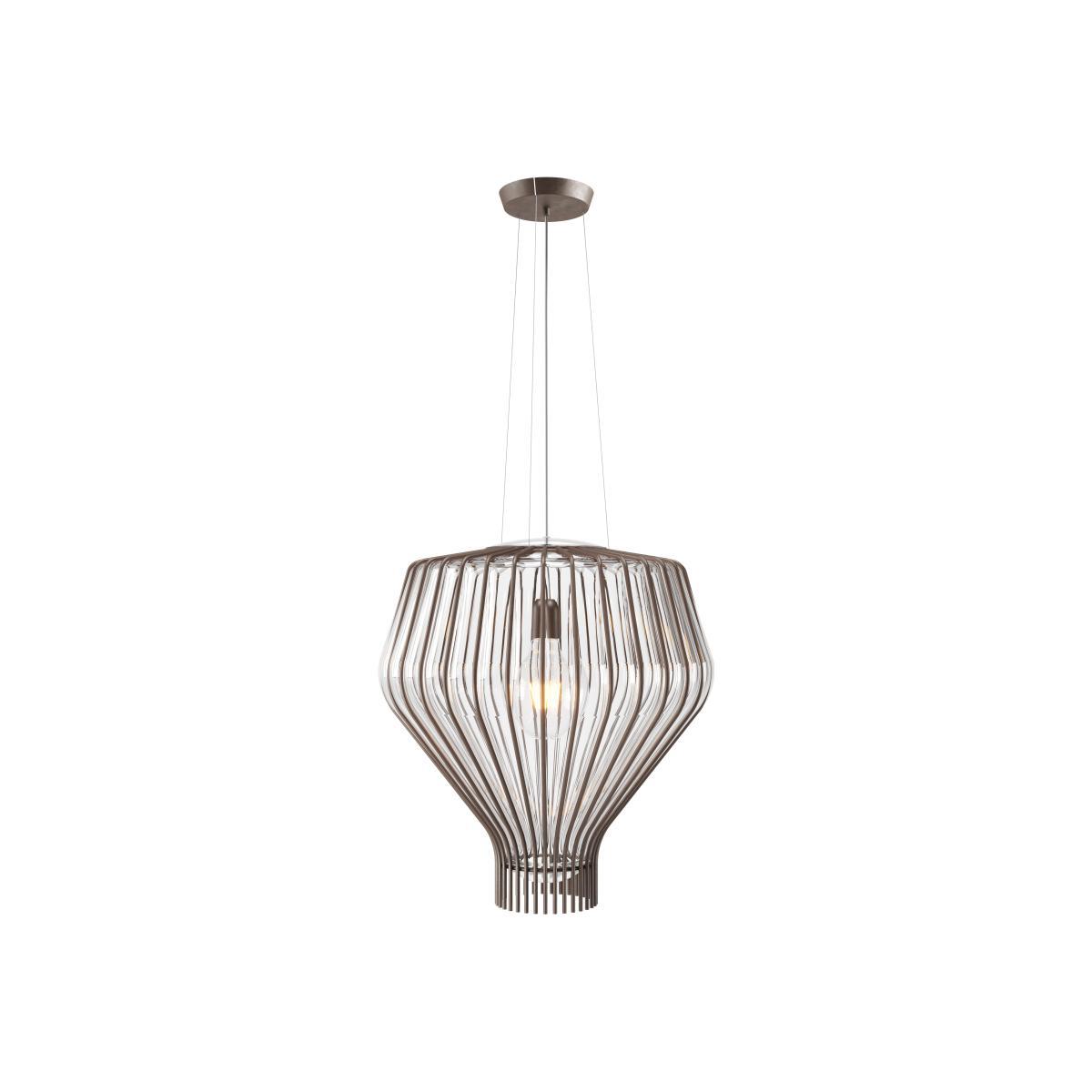 Saya is the new collection of ceiling lights designed by Gio Minelli and Marco Fossati. This project takes us on a journey between the east and the west, where the aestheticism and memory of faraway cultures combine with the ancient Venetian tradition of glass blown in a cage. The glass is blown directly inside the brushed metal cage. The metal wires are inserted into the molten glass creating a striated pattern. The slightly inflated glass gives rise to subtly rounded forms. The shape of the Saya pendant is inspired by a large dewdrop which falls and runs downwards, along all of the metal wires which, by closing up, stop its fall. The sensual vocabulary and the visual sophistication which the Saya pendant gives off speak to our emotions. A masterful, suggestive, high-impact object, both when switched on and off.