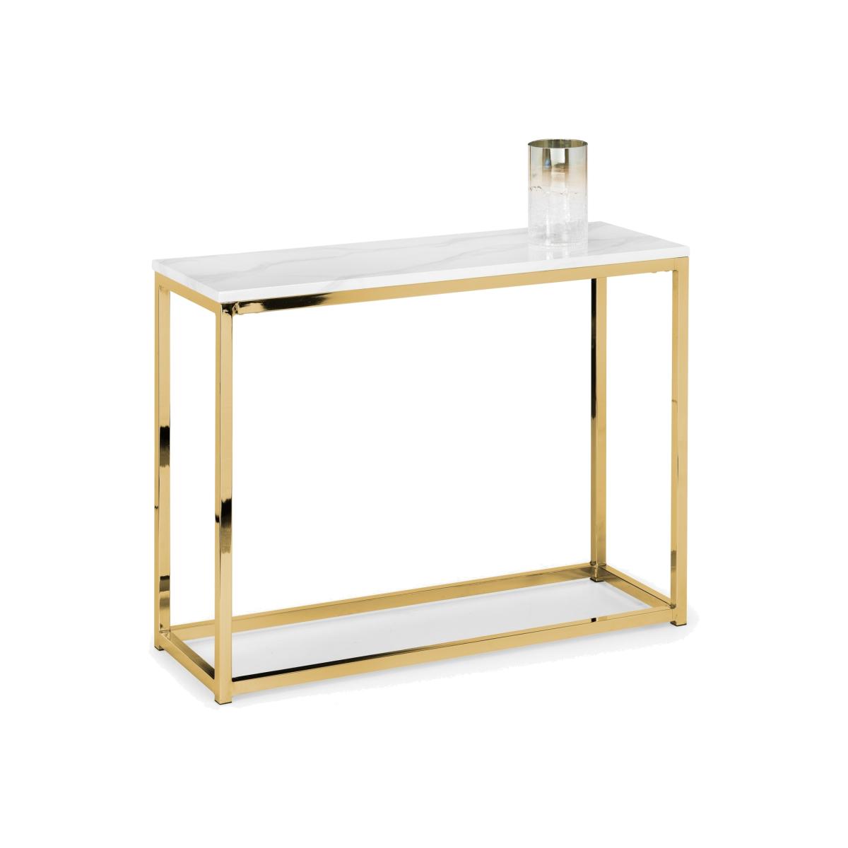 Scala is a sleek console table with a chic marble effect top on a well-crafted gold-coloured, stainless steel frame. It has a timeless Italian design that fits well with a wide range of decorative styles. Part of the Julian Bowen Scala Occasional furniture range.