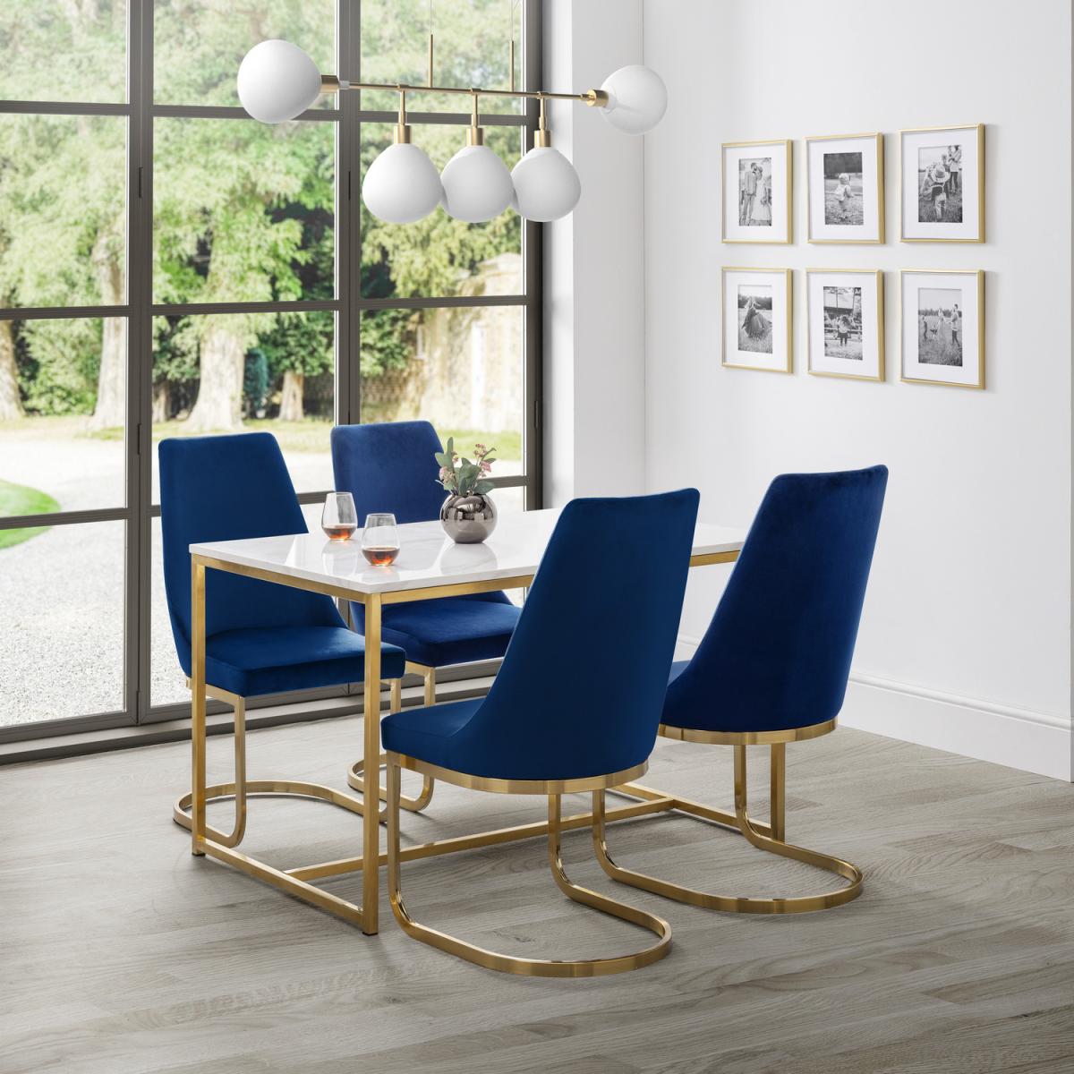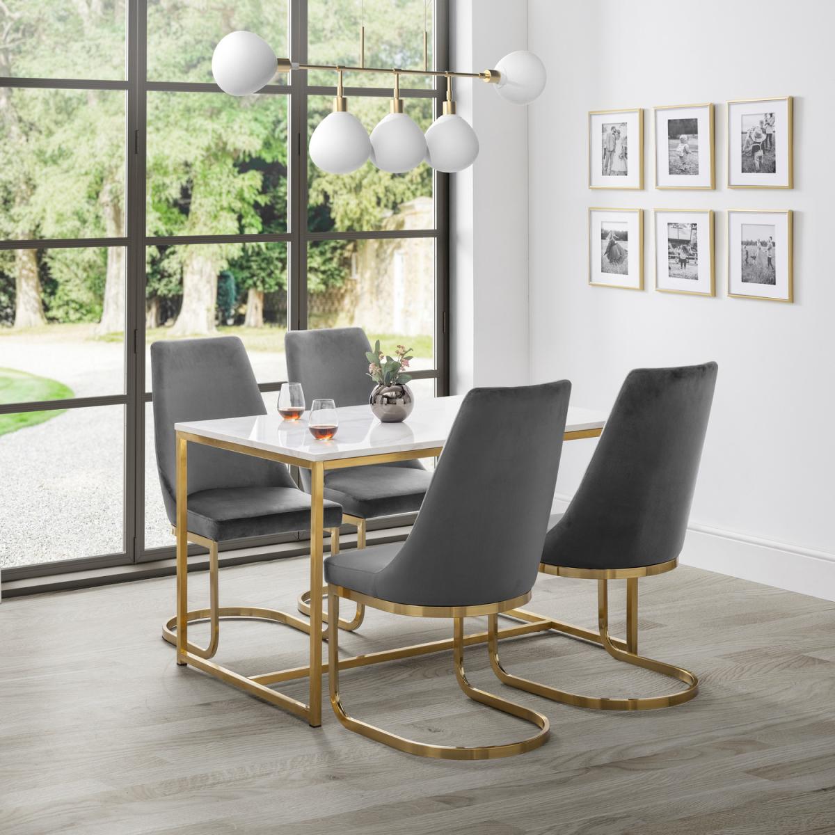 I love this set for its sleek, modern look that works well in a variety of interiors-from contemporary open-plan spaces to more minimalist dining rooms. The grey Vittoria chairs bring a subtle sophistication, while the gold accents of the Scala table add warmth and elegance without overwhelming the space. It’s a versatile combo that lends itself well to both casual family meals and more formal dinner parties. Practical styling tips include pairing it with a neutral or textured rug underneath to anchor the table, or adding vibrant or patterned accessories for a pop of colour. This set is a great choice if you want a stylish, functional dining area that feels understated yet polished.