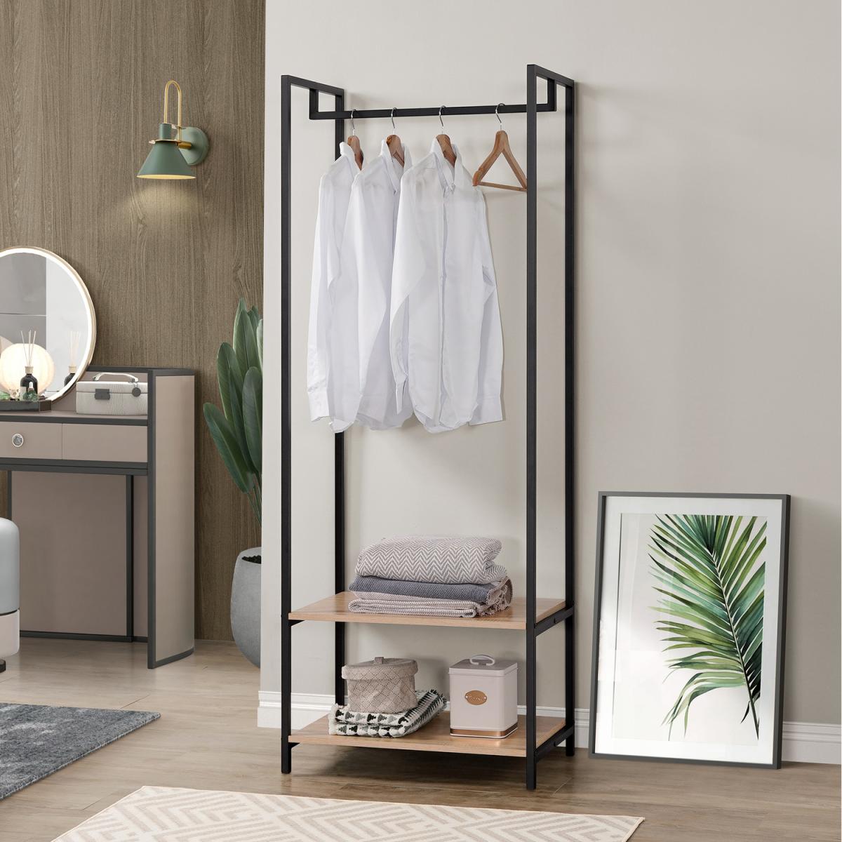 This modern 2-shelf open wardrobe is a stylish and functional addition to any bedroom or living space. Crafted with a sleek black metal frame, it offers a minimalist aesthetic that complements various interior design styles.