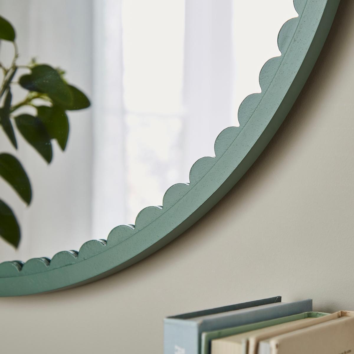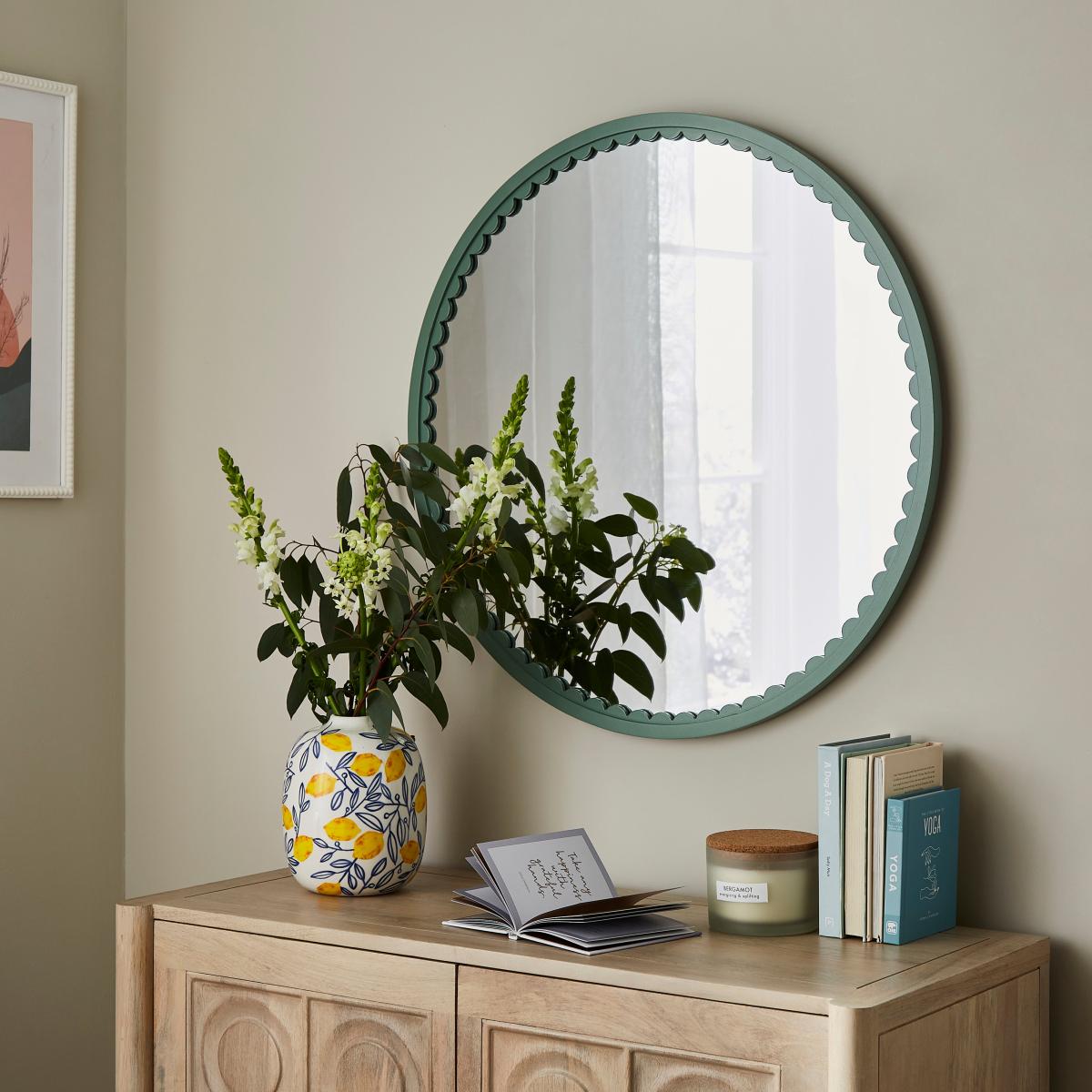 I really like this round wall mirror with its scalloped green border - it adds a subtle pop of colour without overwhelming the space. It works particularly well in interiors that blend modern and traditional styles, such as a Shabby Chic or coastal scheme, where it can complement soft colour palettes and natural textures. For styling tips, try positioning it above a neutral console or sideboard to create a focal point, and pair with greenery or decorative objects to enhance the fresh, inviting feel. This mirror’s playful edge also makes it a great statement piece in a girls’ bedroom or a cosy reading nook, bringing just the right touch of charm and character.