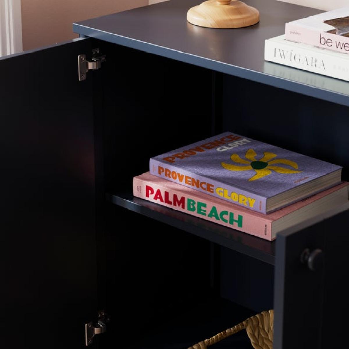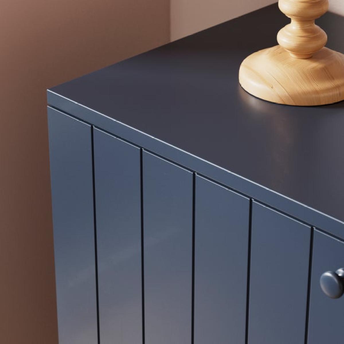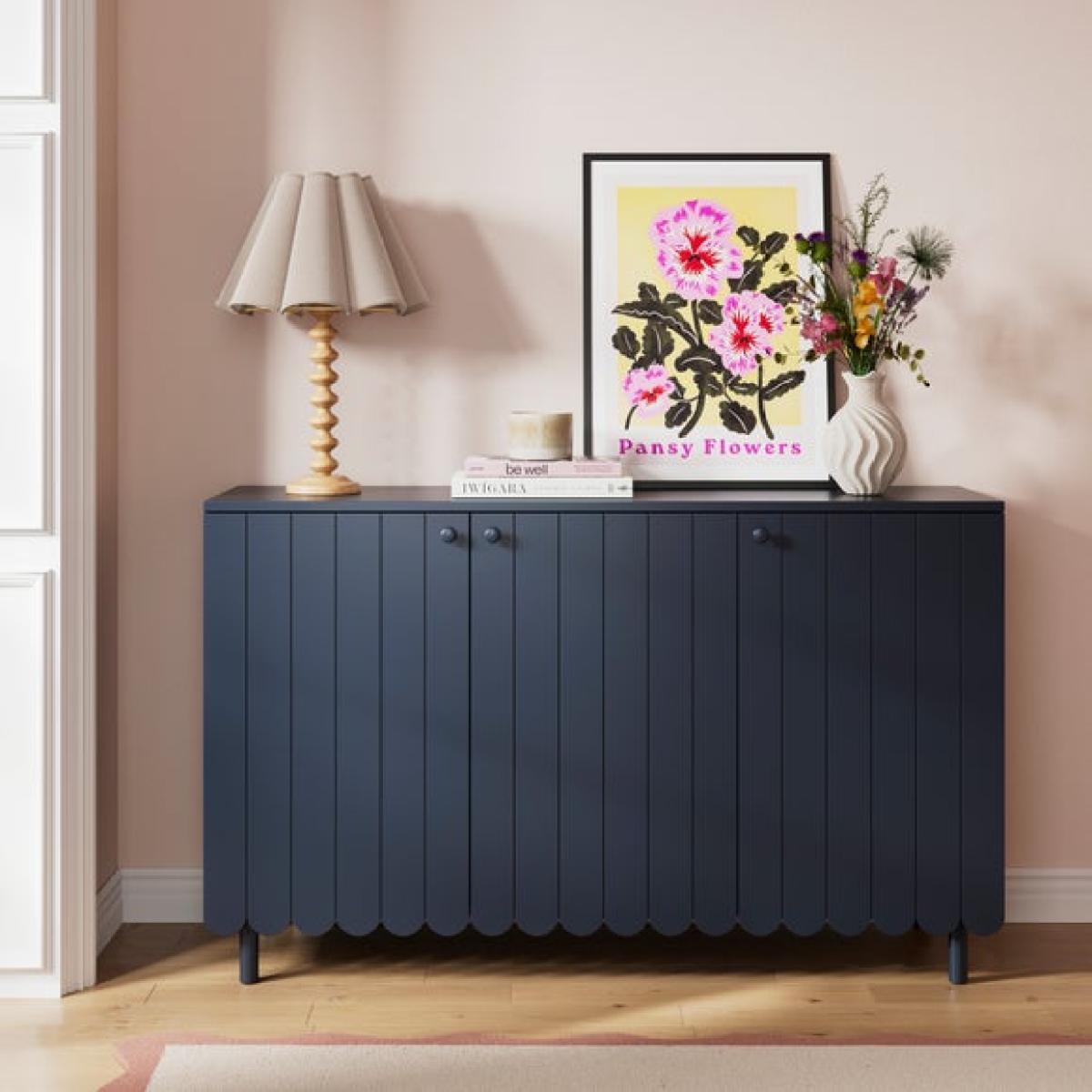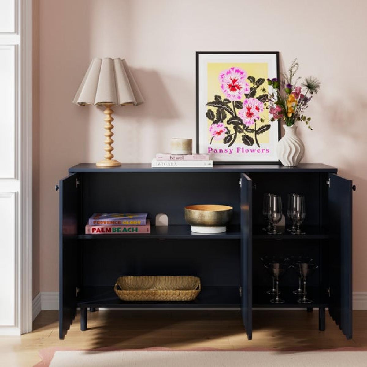 I love this sideboard for its clean lines and versatile design, making it a practical addition to a variety of interiors. Its wide, streamlined profile works well in both modern and contemporary spaces, as well as more traditional settings when styled thoughtfully. The navy hue adds a subtle pop of colour without overwhelming the room, making it easy to coordinate with different colour schemes. Practical styling tips include using the top surface for decorative accessories like lamps or vases, while the internal storage can house tableware, linens, or clutter to keep your space tidy. Its simple yet stylish appearance makes it a flexible piece that can anchor a dining area, living room, or even a hallway scheme.