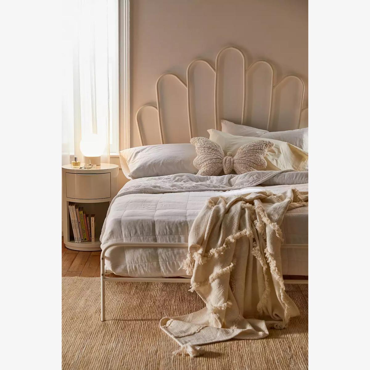 Curl up to sleep in art-deco inspired bed frame from UO. This scalloped-edge metal bed frame features a statement headboard with gently curved edges, crafted from a lightweight metal with a powder-coated finish. *Online return only. This item cannot be returned instore. Please note furniture items currently cannot be shipped to Northern Ireland or The Republic of Ireland. Delivery of large furniture items may take 1-2 weeks and are therefore not eligible for Next Day Delivery.* **Content + Care** \- Assembly required - we recommend two people for assembly. Assembly instructions and hardware are included. \- Iron \- Wipe clean **Size** \- 203.8cm x 153.6cm x 145cm \- Fits standard UK king mattress