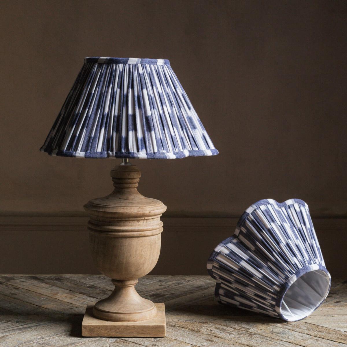 Introduce understated elegance to your living space with these navy ikat scalloped-edge lampshades. Handmade using an ikat fabric which is printed before weaving to create a beautiful pattern and meticulously gathered for texture. 13” (ABK1022): Height: 20cm, Top Diameter: 15cm, Bottom Diameter: 33cm. 16” (ABK1023): Height 23cm, Top Diameter: 18cm, Bottom Diameter: 40cm. Handmade from pure linen with an iron frame. This product is handmade, so finishing may vary and seamlines may be visible. Read the Lampshade Guide.