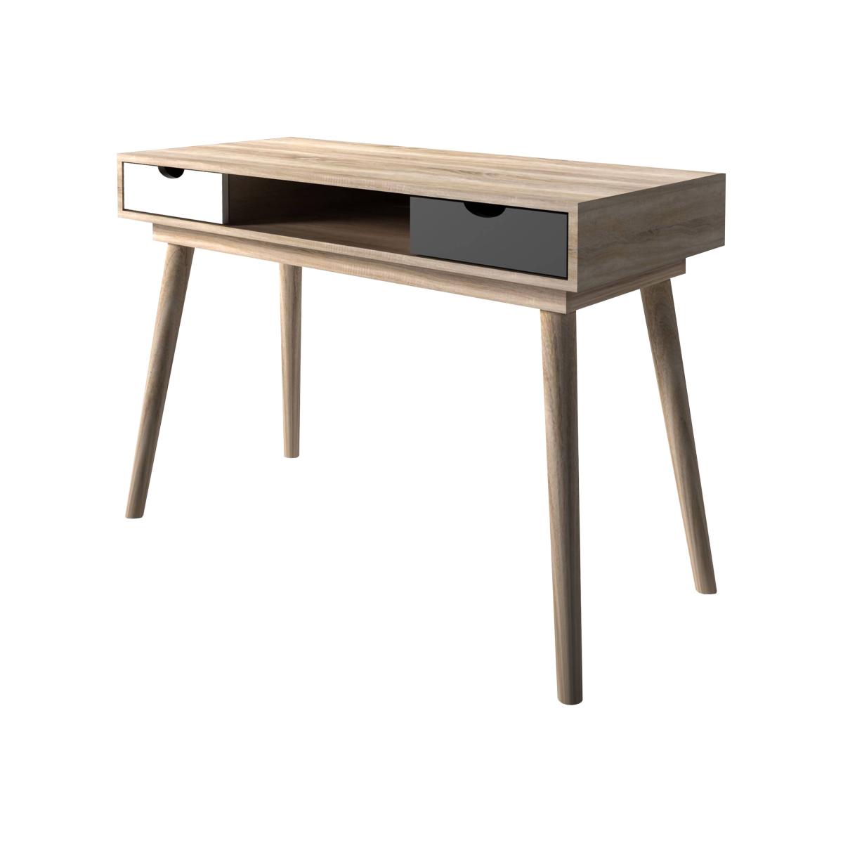 Modern desk boasting an oak effect finish. A stylish addition to your office space, this desk is part of the Scandi range. Composed of MDF, this modern piece boasts an oak effect finish and comes complete with a white drawer and a grey drawer, ideal for storing your paperwork or stationery, meanwhile the empty space inbetween is ideal for housing your keyboard. It is perfect for use in bedrooms and studies.