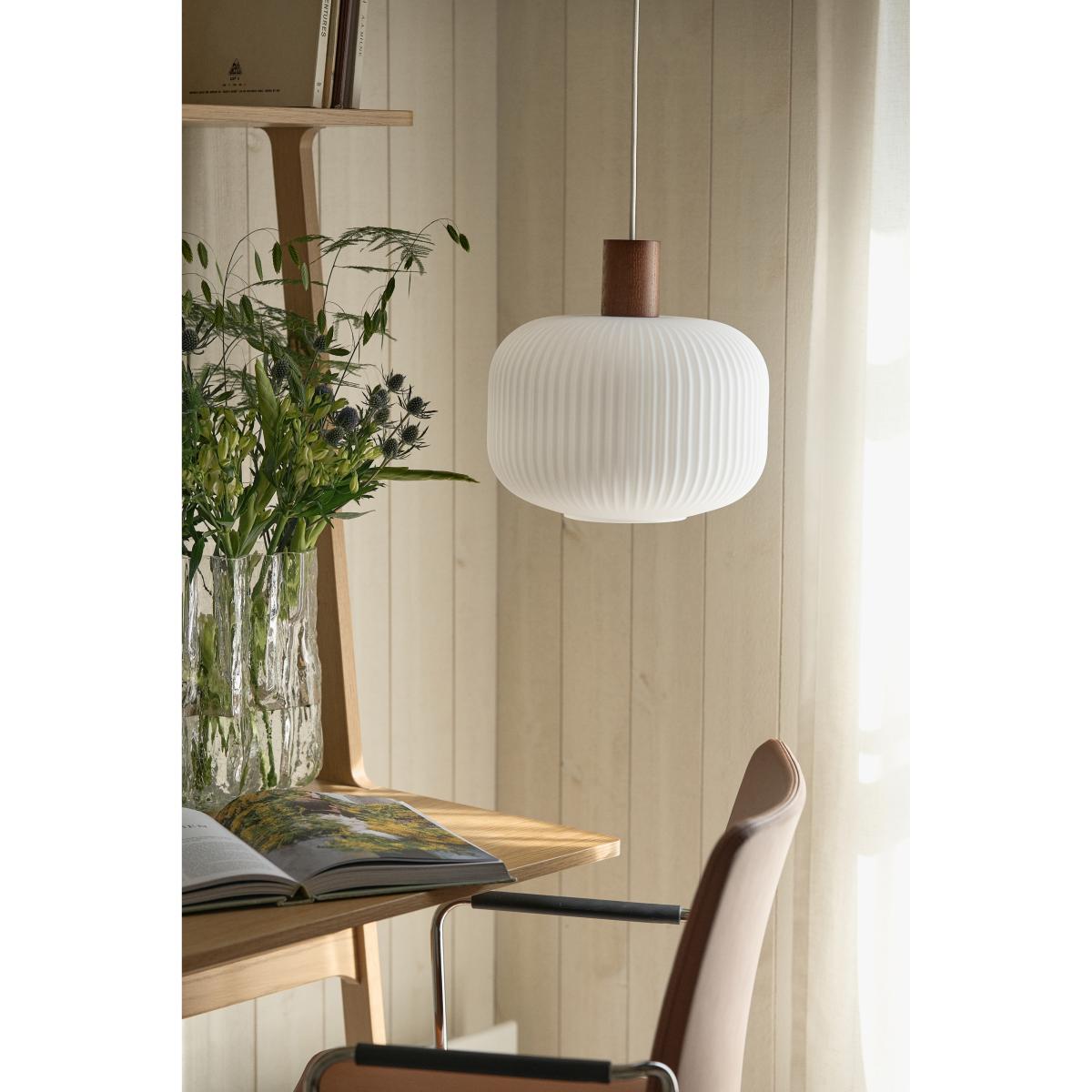 Fair ceiling lamp 30 cm from Swedish Scandi Living has a softly shaped lampshade in frosted glass with a ribbed surface as well as a cylinder formed detail in beautiful ash above. The ceiling lamp gives off a pleasant general light and is, with its beautiful design, lovely in a living room or a bedroom.