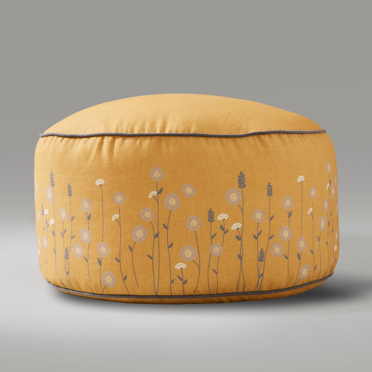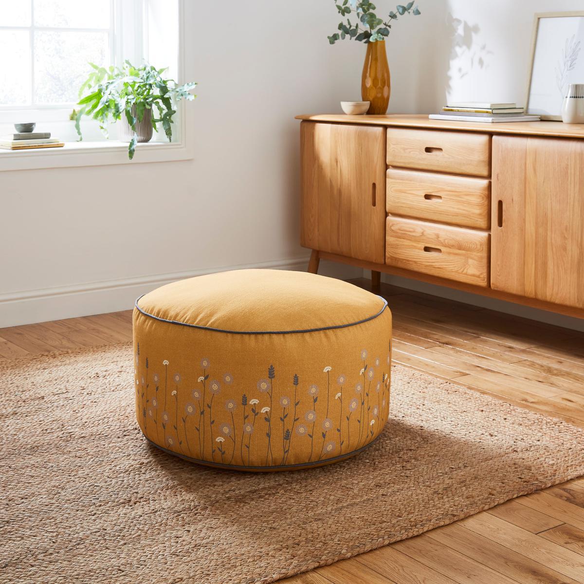 This pouffe features the beautiful Dunelm scandi design printed on a 100% cotton cover in a stunning ochre colourway. Filled with polystyrene beans, the pouffe is fire resistant.