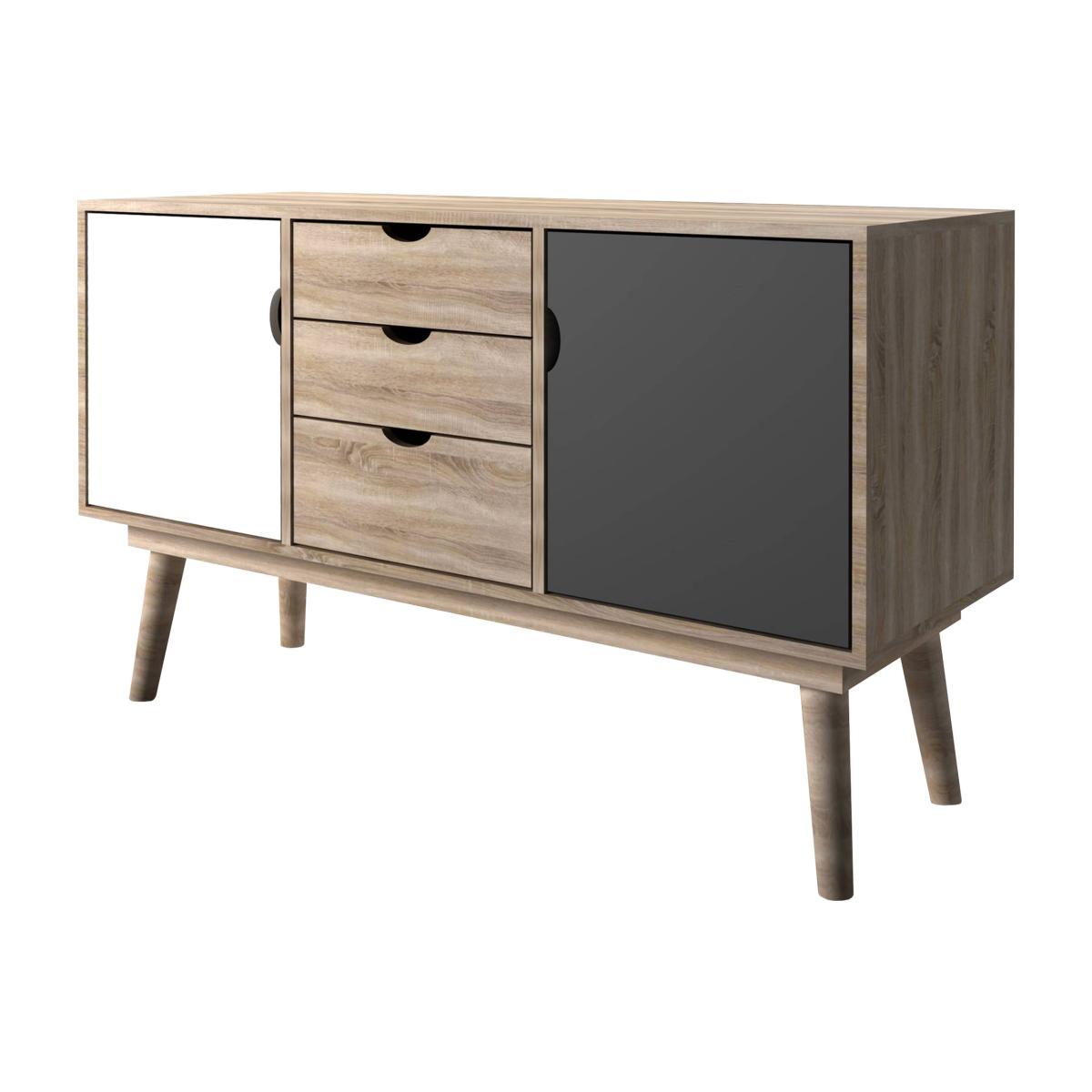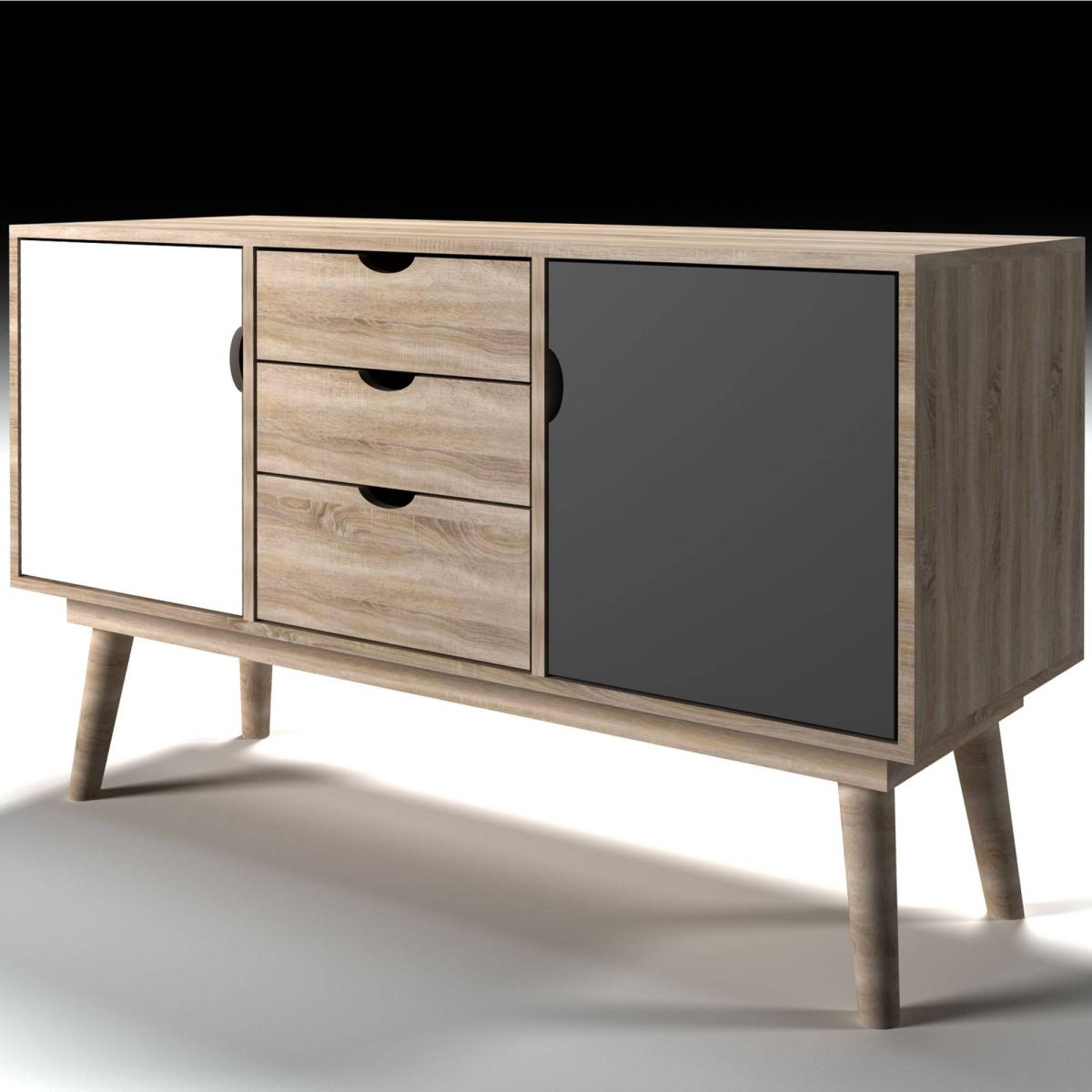 Modern sideboard boasting an oak effect finish. A stylish addition to your home, this sideboard is part of the Scandi range. Composed of MDF, this modern piece boasts an oak effect finish and features a white cupboard and a grey cupboard. Completing the piece are 3 drawers in the centre. It is perfect for use in living rooms, hallways and dining rooms.