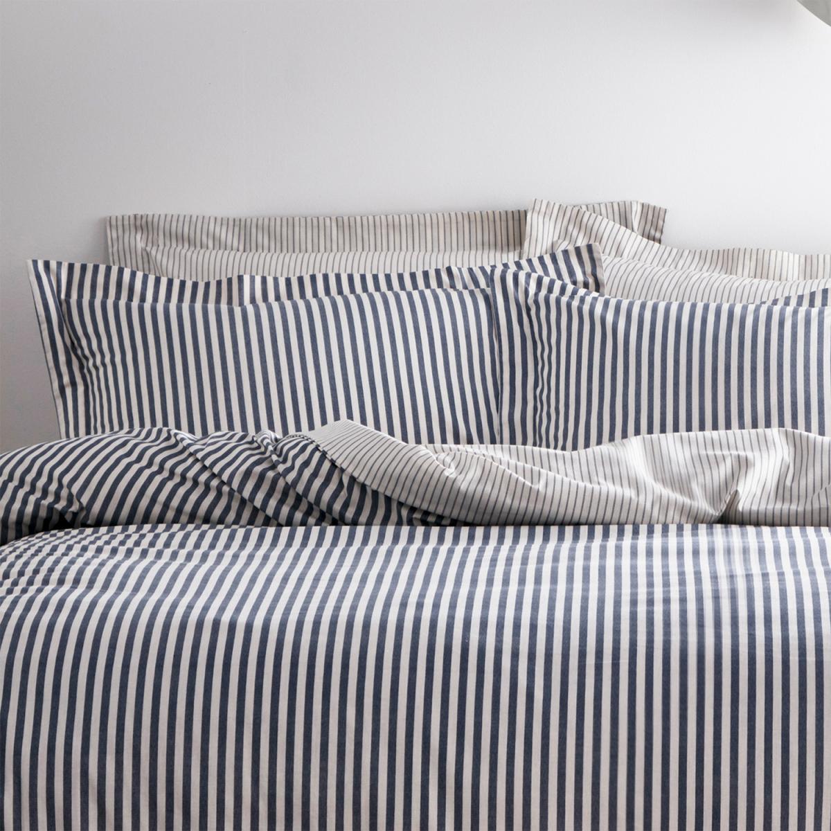 I love the navy stripe design for its classic yet contemporary feel, making it a versatile choice for various interiors. This duvet set works particularly well in modern Scandinavian-inspired spaces due to its clean lines and understated colour palette, but it can also add a fresh touch to more traditional or minimalist bedrooms. Practical styling tips include pairing with neutral or textured bedding for added dimension, and complementing it with soft, cosy accessories like knitted throws or velvet cushions in muted tones. For a balanced look, keep the surrounding décor simple to let the stripes stand out or layer in some navy accents through cushions or decorative objects to create cohesion.