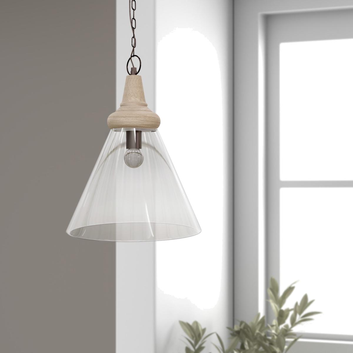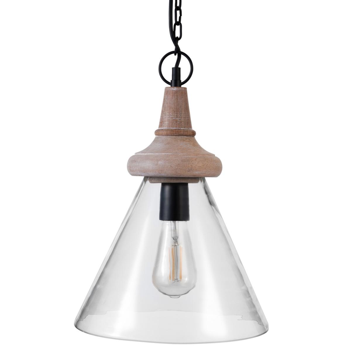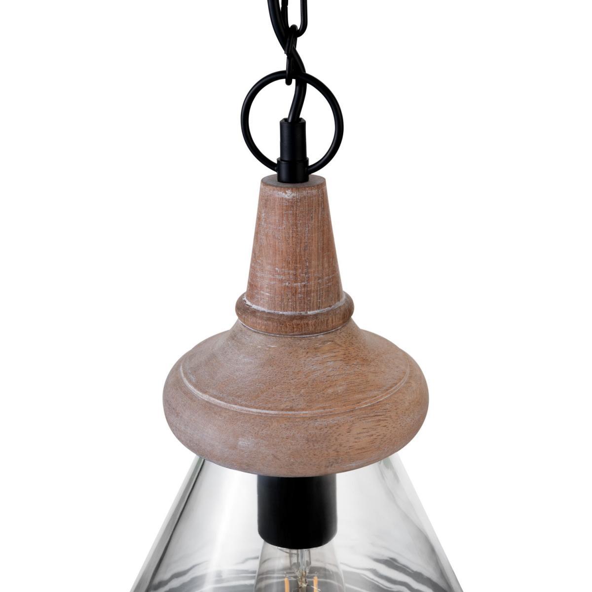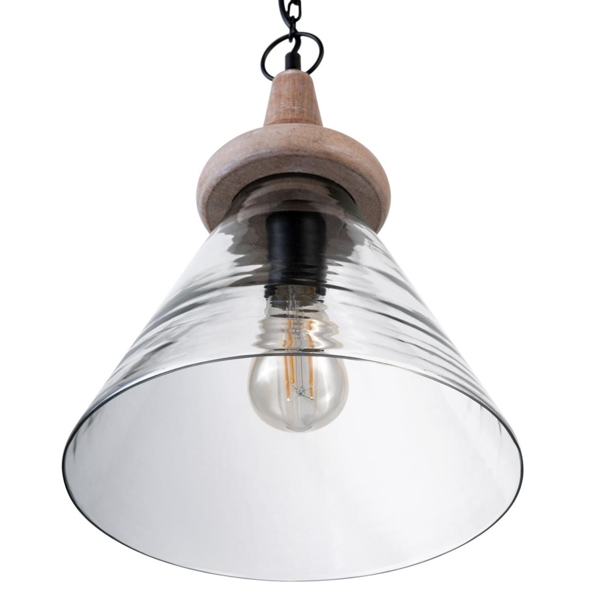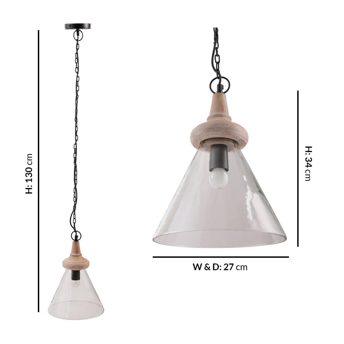 Features we love Glass cone pendant light with wooden top Scandi minimalist style complements any home Hang over a breakfast bar or in your living roomE2. 7 and LED bulb compatible can be dimmed. Shade dimensions W27 x D27 x H34cm Need to know. Overall dimensions. W27 x D27 x H34 cm (not including cable) Ceiling cup dimensions. W12 x D12 x H2.25 cm Overall drop. 130 cm Range. Durham Style. Modern Fixture design. Ceiling pendant Switch type. On-Off Number of lights. 1 Bulb type. E27 Maximum wattage. 40W Colour. Clear black and white wash (wood) Finish. Powder-coated painted and braided cable Material. Glass wood and iron LED compatible. Yes Dimmer compatible. Yes Bulb included. No Weight. 2kg Fixings supplied. Yes Assembly required. No Warranty. 1 year.