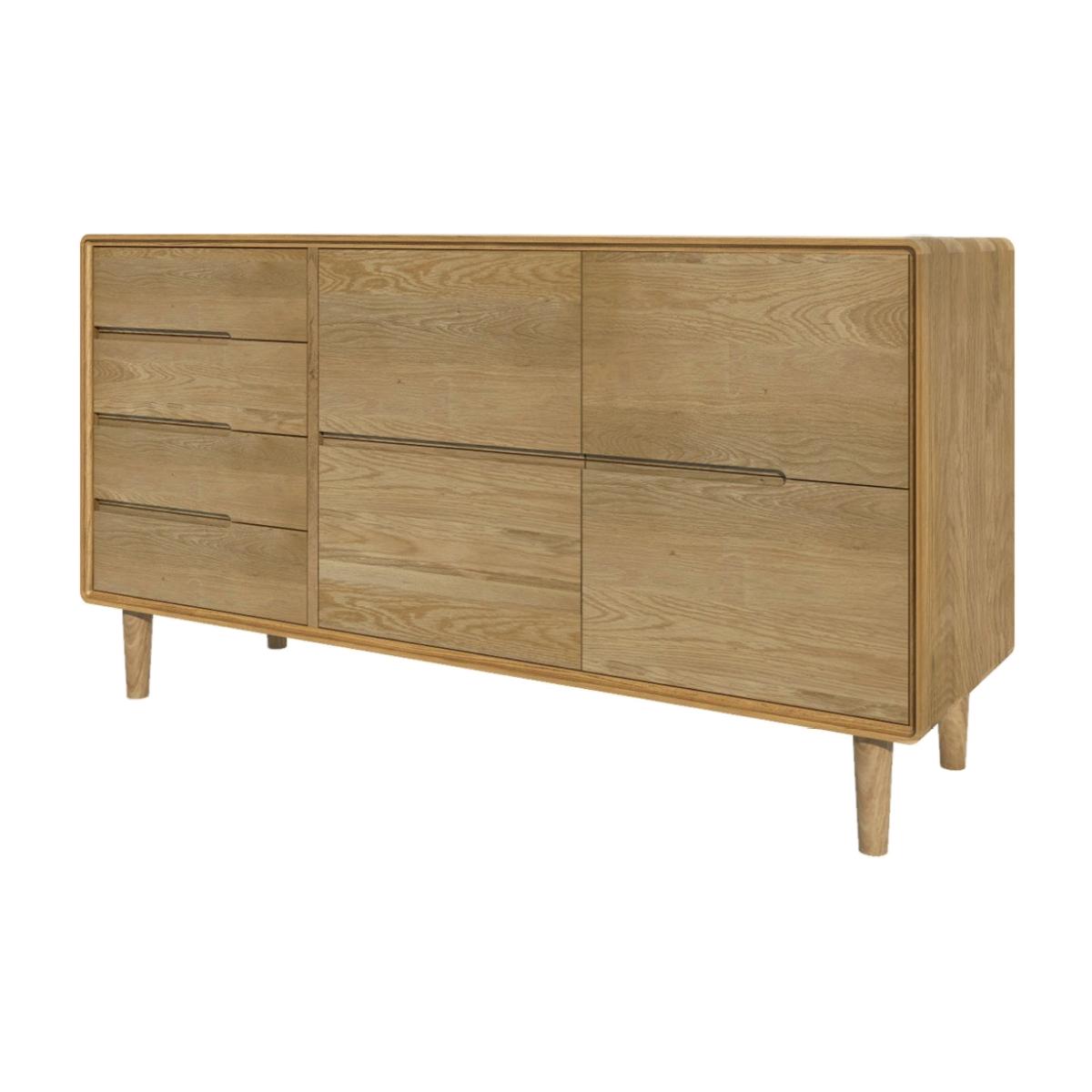 The Scandic Large Sideboard is a significant and eye-catching piece for the modern home, providing practical storage and effortlessly elegant style to any room it calls home. Incorporating a number of drawers of different sizes, creating an asymmetrical yet instantly captivating look. The finest oak ensures a premium, long-lasting finish too. Retro-inspired Scandinavian styleSoft rounded edges and curved legs for a contemporary feel. Dovetail joints and easy glide metal runners on all drawers. Minimalist integrated grooved handles