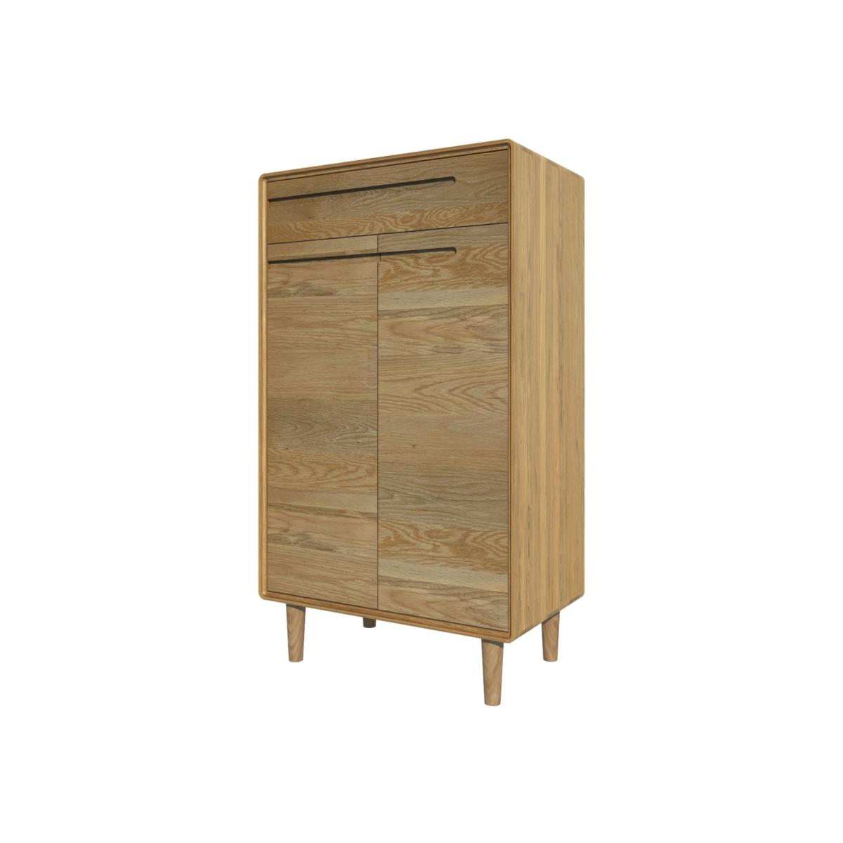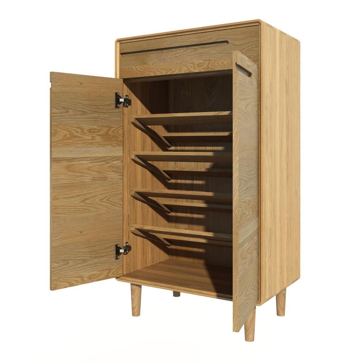 The Scandic Shoe Cabinet is an exceptionally stylish way to keep all your shoes and boots practically stored out of sight. The elegant and retro-inspired simplicity of its design ensures it works with many interiors and once opened up, the shelving ensures space for a large shoe collection. 100% solid oak construction Four slatted shelving for practical shoe storage Additional drawer for accessories Integrated groove handles and tapered legs for a contemporary finish
