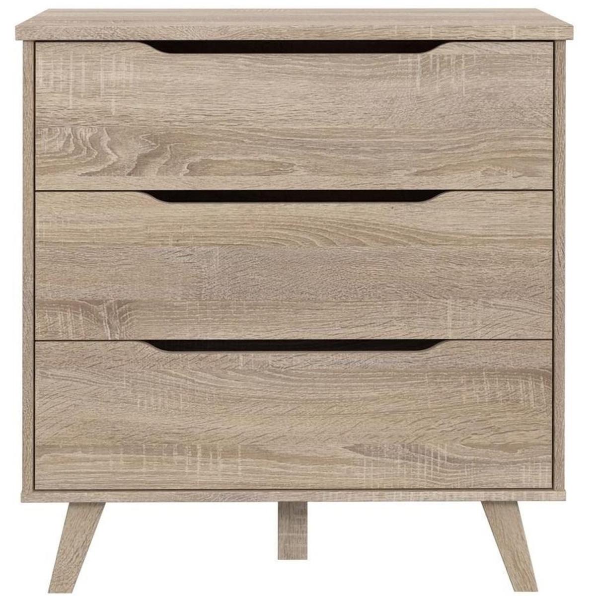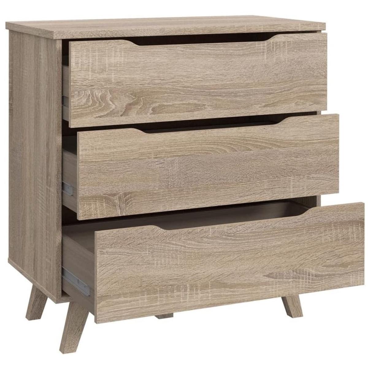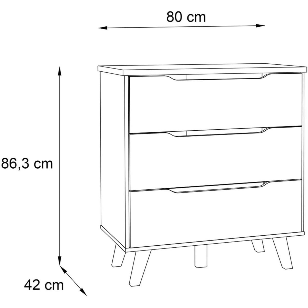 This 3 Drawer Bedroom Chest of Drawers has a Scandinavian design standing proudly on four wooden legs. It has a light oak textured effect finish frame and drawer fronts. Delivered flat-pack for home assembly. European made to exacting standards- cut-out drawer handle design- light oak effect frame and legs- easy-glide metal runners. Once assembled - this large chest of 3 drawers measures 80 cm width by 42 cm depth by 86.3 cm height.