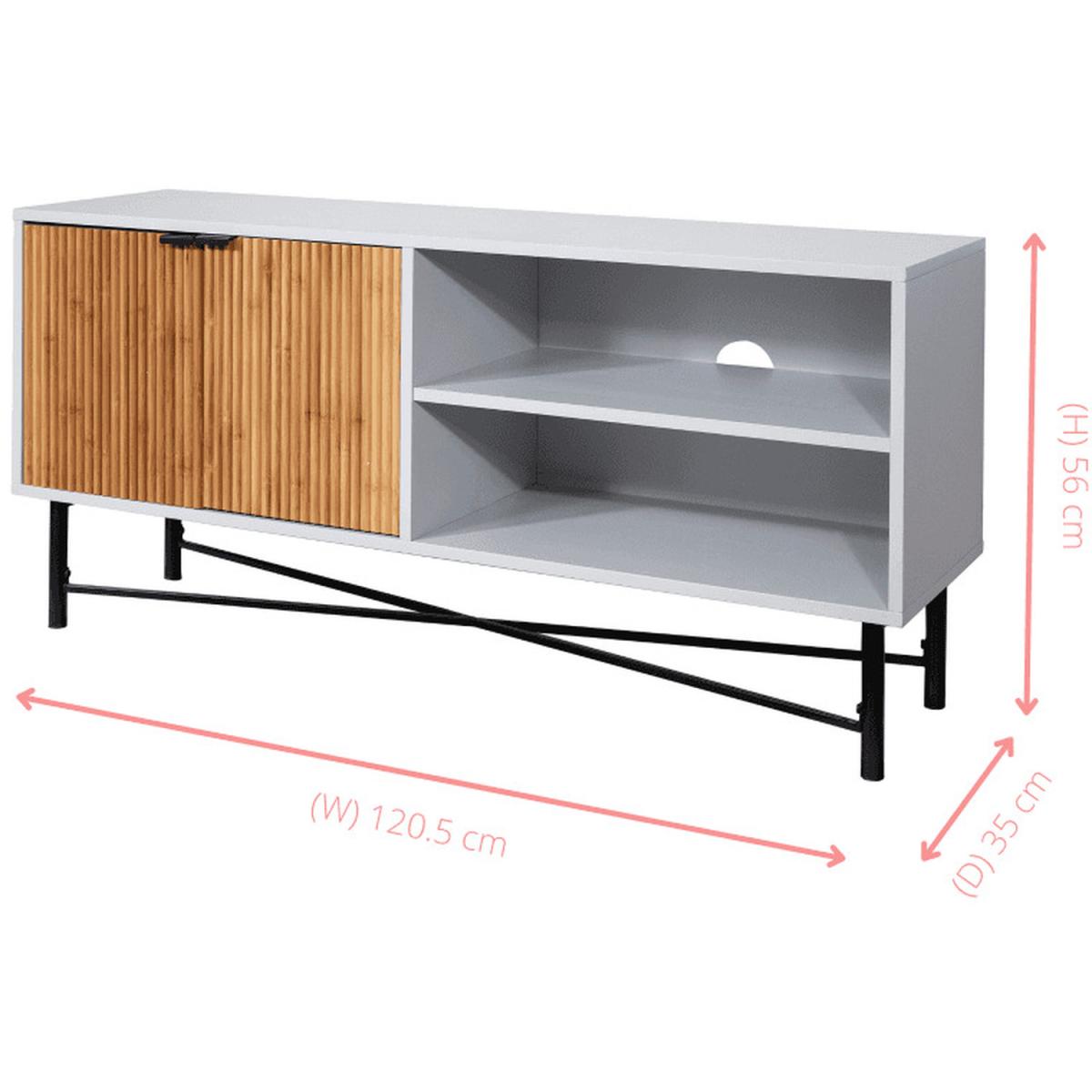 Watching TV has never been so stylish thanks to this TV Unit. An ultra-chic accoutrement to your plasma TV, this piece oozes character with minimal modernism. A fusion of contrasting textures and colours, the TV unit accentuates without demanding attention. A crisp grey body, natural pine doors and black metal legs epitomise contemporary chic. Introduce a splattering of fluffy accessories and pastel colours to soften the look. Pampas grass and blush pink vases will work a treat.