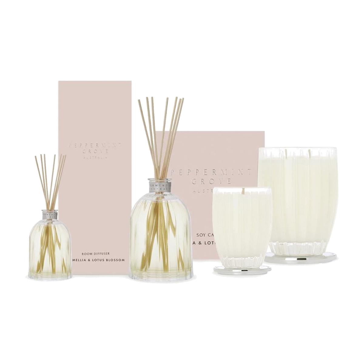 Breathe beautiful floral fragrance into your home with this Lily Lotus Flower Scented Candle Diffuser Set from Peppermint Grove. Based in the stunning Southern Highlands of New South Wales, Peppermint Grove Australia is a brand that truly encapsulates the beauty and charm of Australian living, with a collection of carefully crafted and sustainably sourced home fragrances that each encapsulate a unique part of the Australian landscape. This natural soy wax candle has a lead-free cotton wick that provides a longer, cleaner and environmentally friendly burn. Each piece in this set has been hand poured into a custom-designed, highly polished glass, which can be reused for a multitude of purposes once your fragrance has finished, think makeup brush holders, plant pots, or even a drinking glass!This white floral fragrance embodies fallen green leaves and stunning white flowers on a peaceful autumn day. It combines notes of orchid, lily-of-the-valley, magnolia and lotus flower to produce a fragrance that is timeless and tranquil, peaceful and unique.