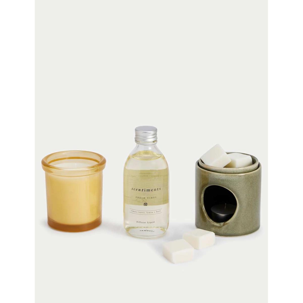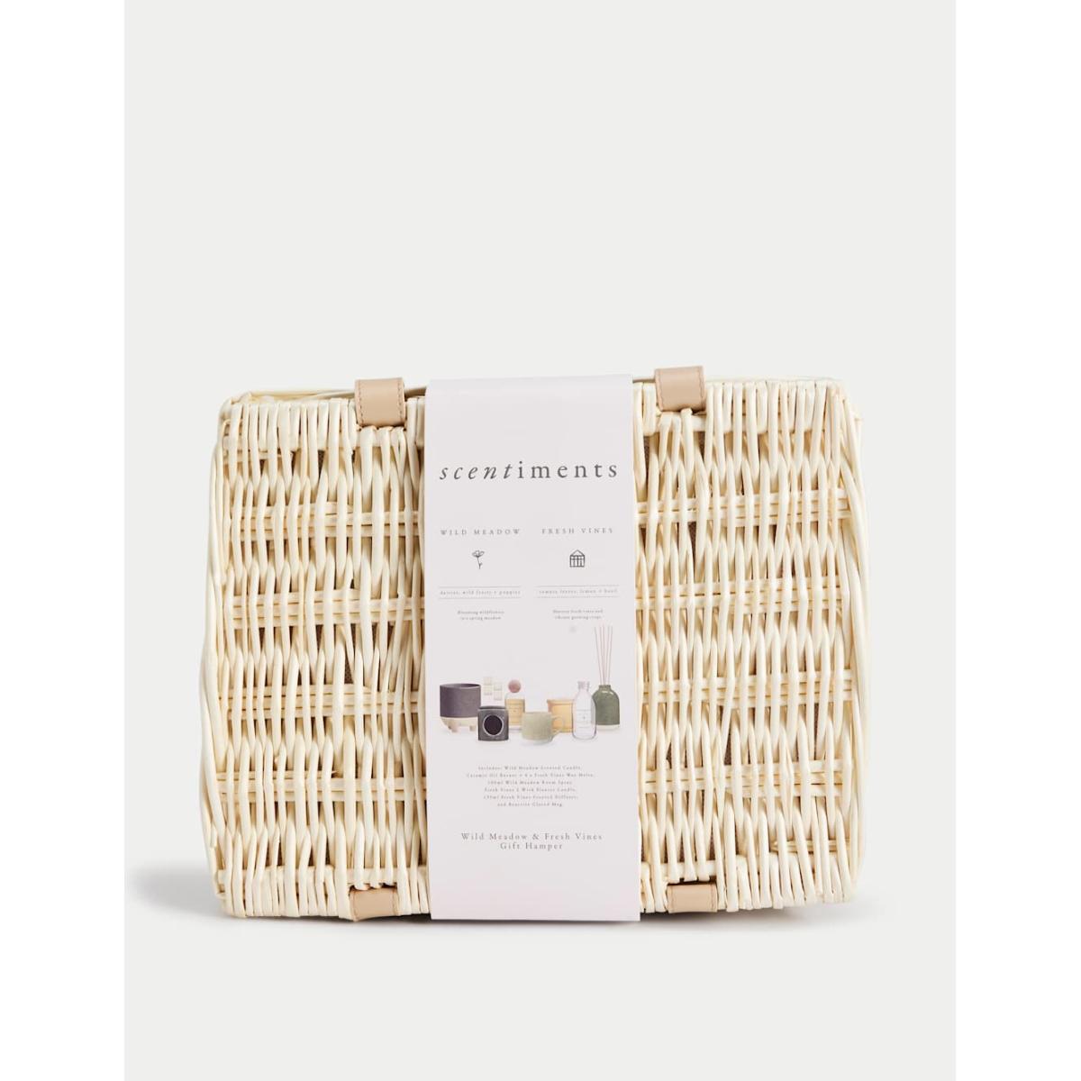Our Scentiments™ Gift Hamper showcases our Wild Meadow and Fresh Vines ranges. This large set includes a scented candle, a planter candle, four wax melts and a room spray. There's also a scented diffuser, a ceramic oil burner and a beautiful reactive glazed mug, all housed in a reusable wicker basket. It makes a wonderful gift for someone special. This fragrance is part of the Fruity family of fragrances. Fruity scents are refreshing and tropical and will often have notes of berries and non-citrus fruits such as pomegranate, apple and sweet pears.