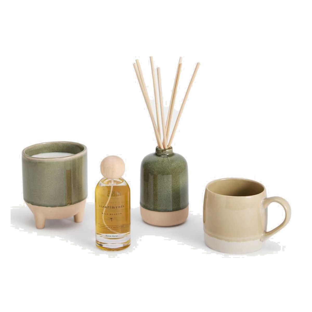 I love this little set for its versatility and understated charm. It works particularly well in modern, minimalist interiors due to its soft earthy tones and simple shapes, adding a touch of natural warmth. It’s perfect for styling on open shelving, side tables, or near the sink, creating a calming, functional vignette. For a cohesive look, pair it with other natural materials like wood or stone, and keep accessories minimal to let the products shine. A practical tip is to use the diffuser and candle elements to add subtle scent and ambiance to a living room or bathroom, making it both decorative and functional.