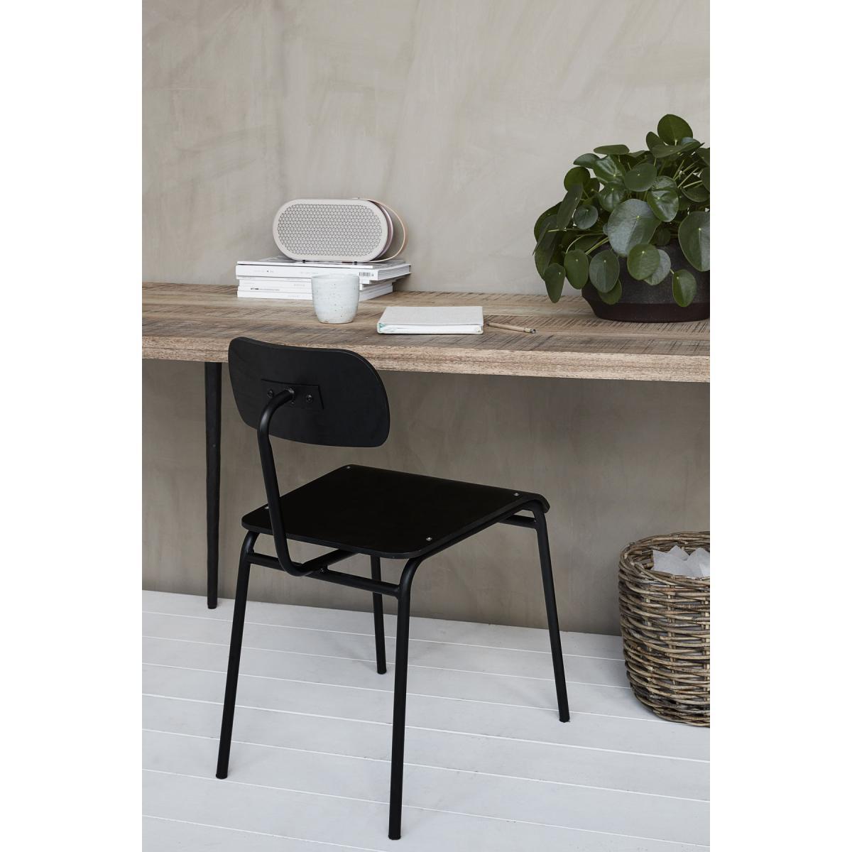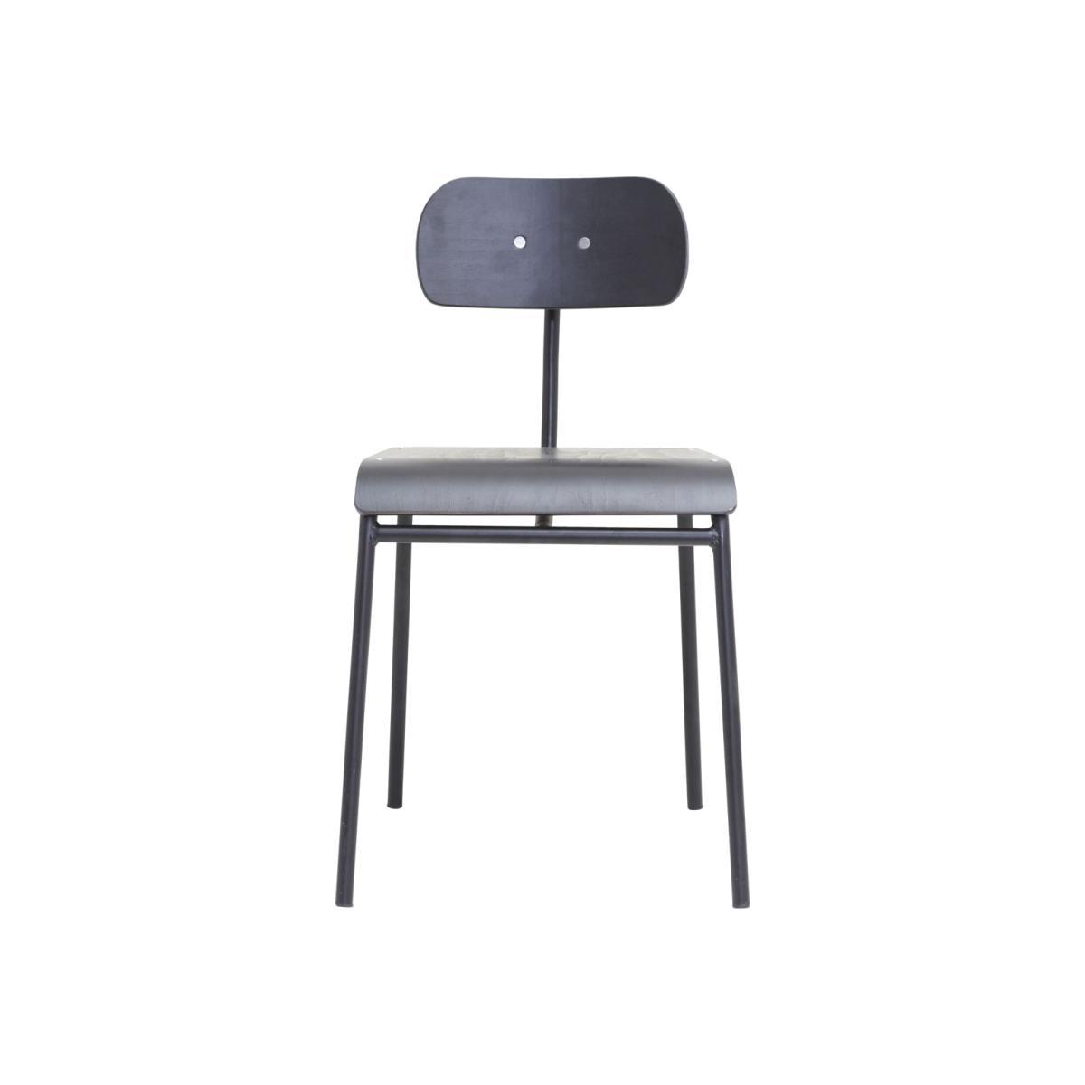 Typical of industrial design, ''School'' is a contemporary reinterpretation of the school chair. A gem of simplicity, it combines an wood plywood seat with a lacquered steel structure. The curved shape and rounded corners of the seat guarantee comfort. The backrest is narrower than the seat, giving School an asymmetrical and endearing silhouette. This chair looks so simple and that is precisely its strength. Nothing is superfluous. When you keep only the essential, the essence remains: a functional, timeless design.