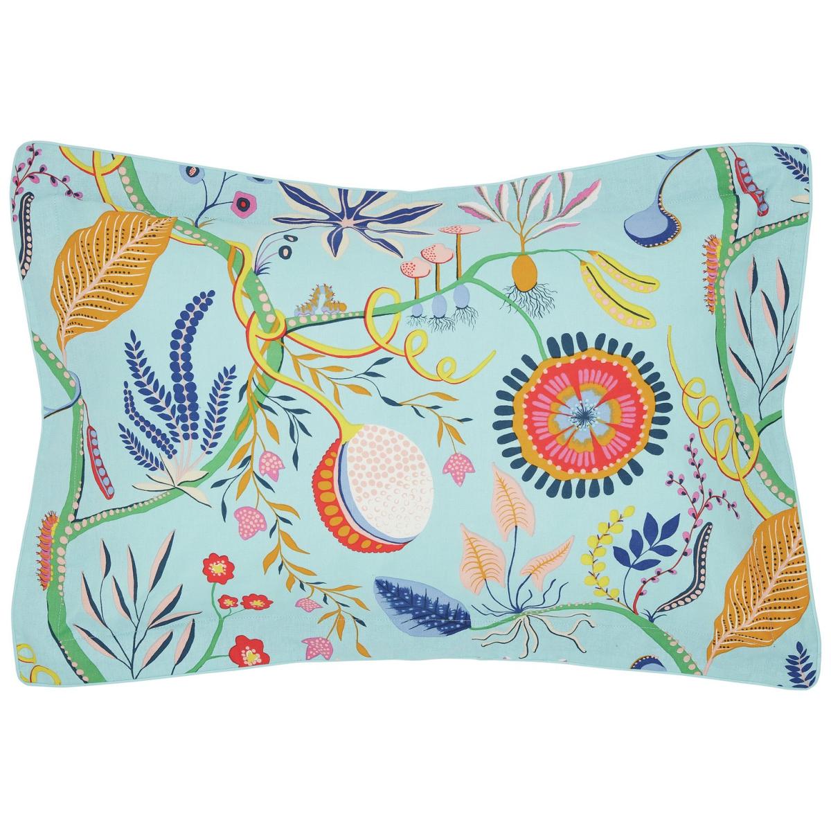 Inspired by the whimsy of Josef Frank's art, Jack Fruit & The Beanstalk rejoices in a large-scale, multicoloured floral pattern of swirling vines and tendrils on a sky-blue background. Vibrant exotic jackfruit and statement floral bursts make this 100% cotton duvet a dream. The reverse pattern is a cheeky horizontal spot motif in navy blue. Bedding sets include a matching Oxford pillowcase. Jackfruit & The Beanstalk sets come in fabric bags crafted from the same duvet cotton material for a happier planet. All over large scale multi coloured floral pattern, Horizontal dot Stripe to reverse. Finish: woven. 100% cotton. Set includes 1 duvet cover and 2 pillowcases. Bed size: double. Length 200cm, Width 200cm. Buttons for fastening. Oxford pillowcase (s). Machine washable. Suitable for tumble drying.
