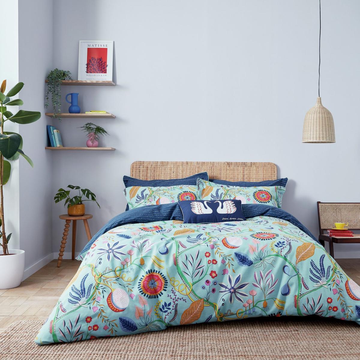 Inspired by the whimsy of Josef Frank's art, Jack Fruit & The Beanstalk rejoices in a large-scale, multicoloured floral pattern of swirling vines and tendrils on a sky-blue background. Vibrant exotic jackfruit and statement floral bursts make this 100% cotton duvet a dream. The reverse pattern is a cheeky horizontal spot motif in navy blue. Bedding sets include a matching Oxford pillowcase. Jackfruit & The Beanstalk sets come in fabric bags crafted from the same duvet cotton material for a happier planet. All over large scale multi coloured floral pattern, Horizontal dot Stripe to reverse. Finish: woven. 100% cotton. Set includes 1 duvet cover and 2 pillowcases. Bed size: king size. Length 220cm, Width 230cm. Buttons for fastening. Oxford pillowcase (s). Machine washable. Suitable for tumble drying.