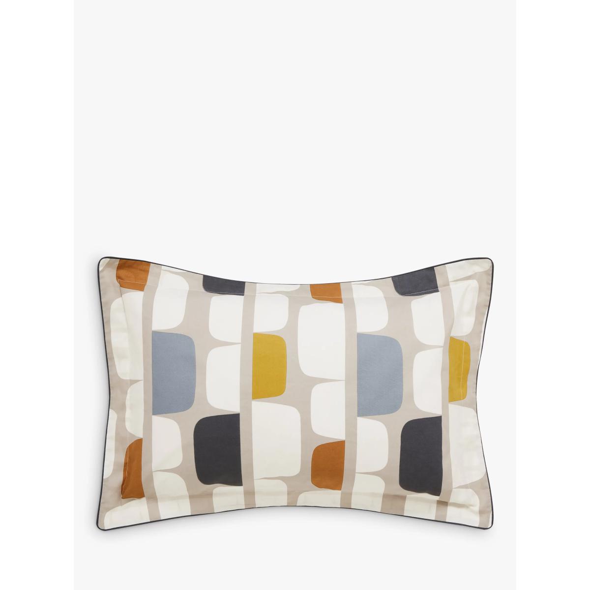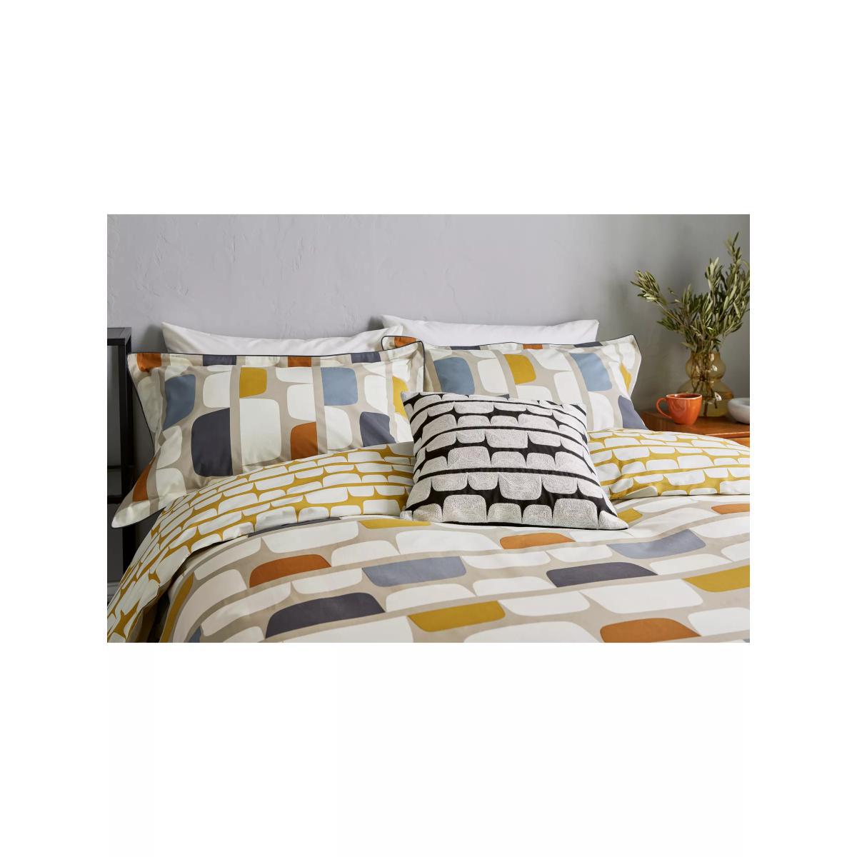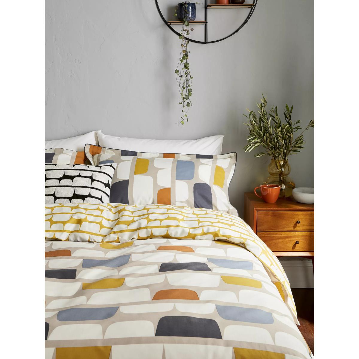 This bedding is printed with Scion's Kivi print, which has a retro colour palette and bold, geometric pattern. Rows of oversized, irregular blocks in warm colour tones feature on the front, and it has a contrast pattern on the reverse. Plus, it's made from pure cotton which is naturally soft and breathable, and will help to keep you cool during the night. Good to know The single set comes with one standard pillowcase, while the double, king and super king sets come with two standard pillowcases. Bedding sizes To fit duvet/pillow size (cm) Standard pillowcase, L75 x W50cm Single duvet cover, L200 x W135cm Double duvet cover, L200 x W200cm King duvet cover, L220 x W225cm Super king duvet cover, L220 x W260cm