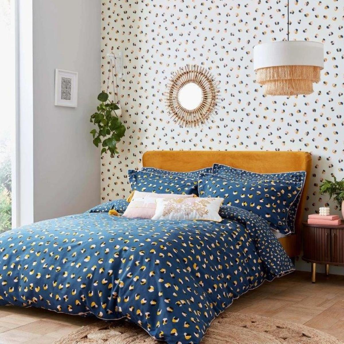 For a pop of animal print in a moodier hue, Leopard dots in denim & milkshake is a stylish take on the print. The fun-loving, leopard spot design in the dark blue and soft pink colourway, has hints of blush on a dark denim background. The reverse is a micro leopard print. The duvet, crafted from 100% cotton certified by the Better Cotton Initiative (BCI) is finished with a sweet milkshake trim and Oxford pillowcase in the same design, colour and pattern. Leopard Dots sets come in fabric bags crafted from the same duvet cotton material for a happier planet. A contrasting cushion ups the nature vibes with an embroidered moody lion pattern, taken from the Rumble in The Jungle print, in shades of ochre and pale pink on an ivory cotton base. Machine Washable 100% BCI Cotton Single Duvet Includes Single Pillowcase Double, King and Superking Size Duvet Includes Pair of Pillowcases All screens vary in colour reproduction and whilst every effort has been made to display the colour as accurately as possible it is for guidance only.