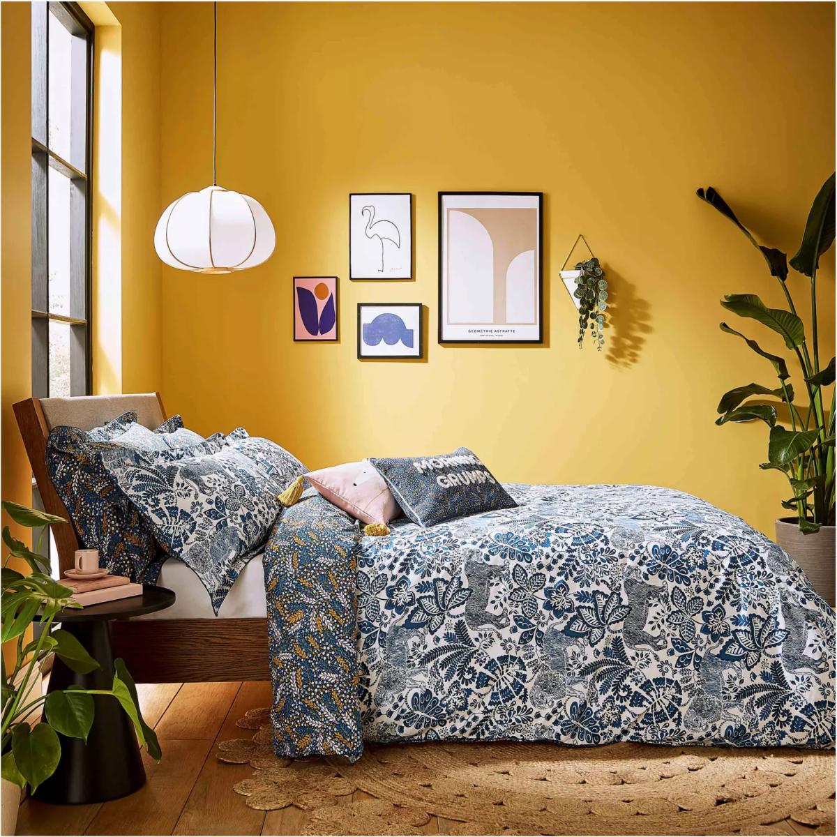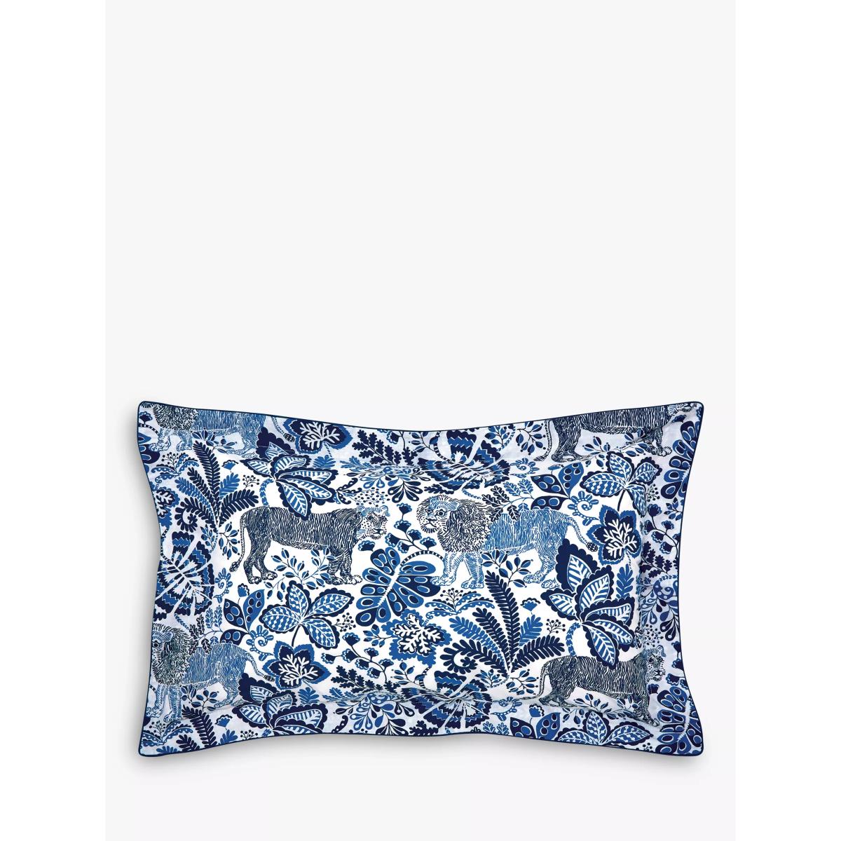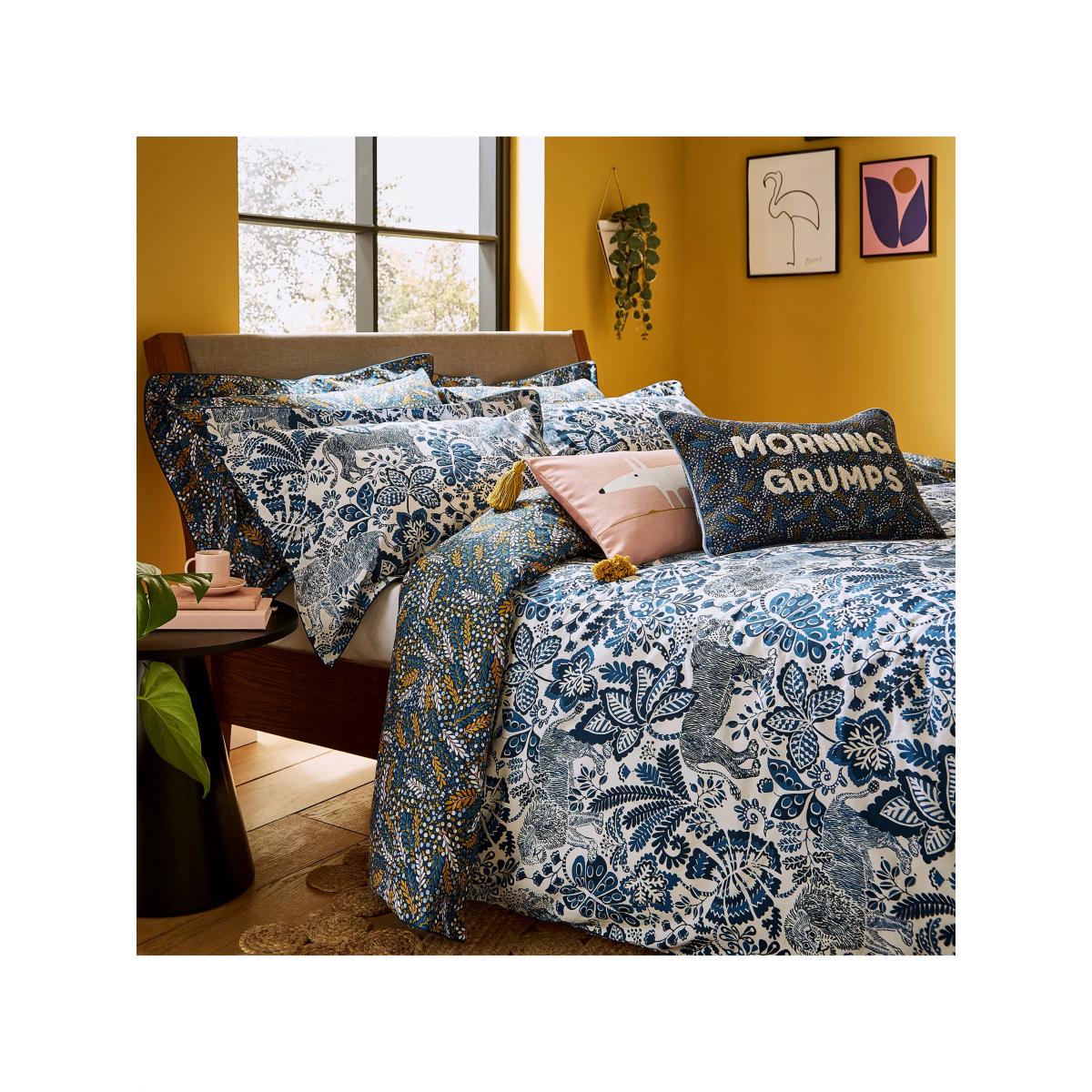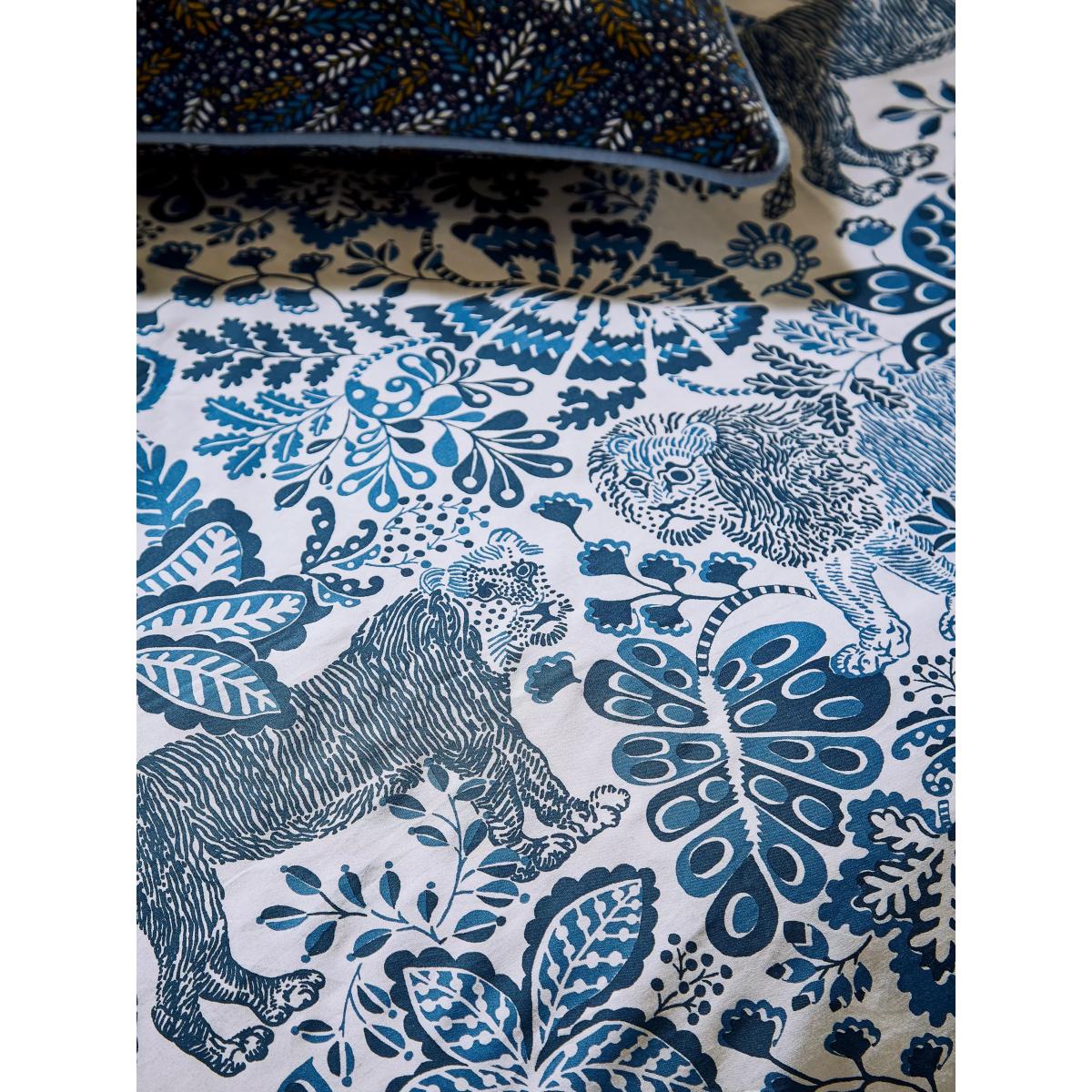For a walk on the wild side, Rumble in the Jungle in denim blue comes to life with a moody lion motif, almost in camouflage against an exotic jungle pattern. Wild and yet tonal, the lion motifs peek out from amongst jungle foliage. Made from 100% cotton certified by the Better Cotton Initiative (BCI), this set is all packaged up in a fabric bag made from the duvet fabric. The single set comes with one Oxford pillowcase, while the double, king and super king sets come with two Oxford pillowcases. Have you thought about sheeting? Shop here. Bedding sizes To fit duvet/pillow size (cm) Oxford pillowcase, L75 x W50cm (plus frill) Single duvet cover, L200 x W135cm Double duvet cover, L200 x W200cm King duvet cover, L220 x W225cm Super king duvet cover, L220 x W260cm