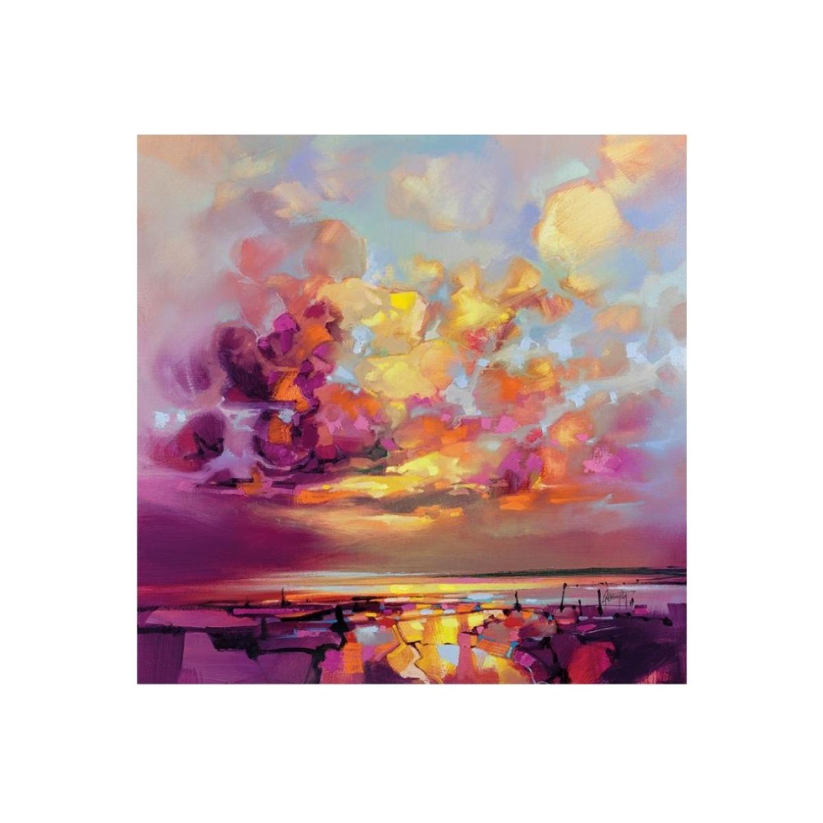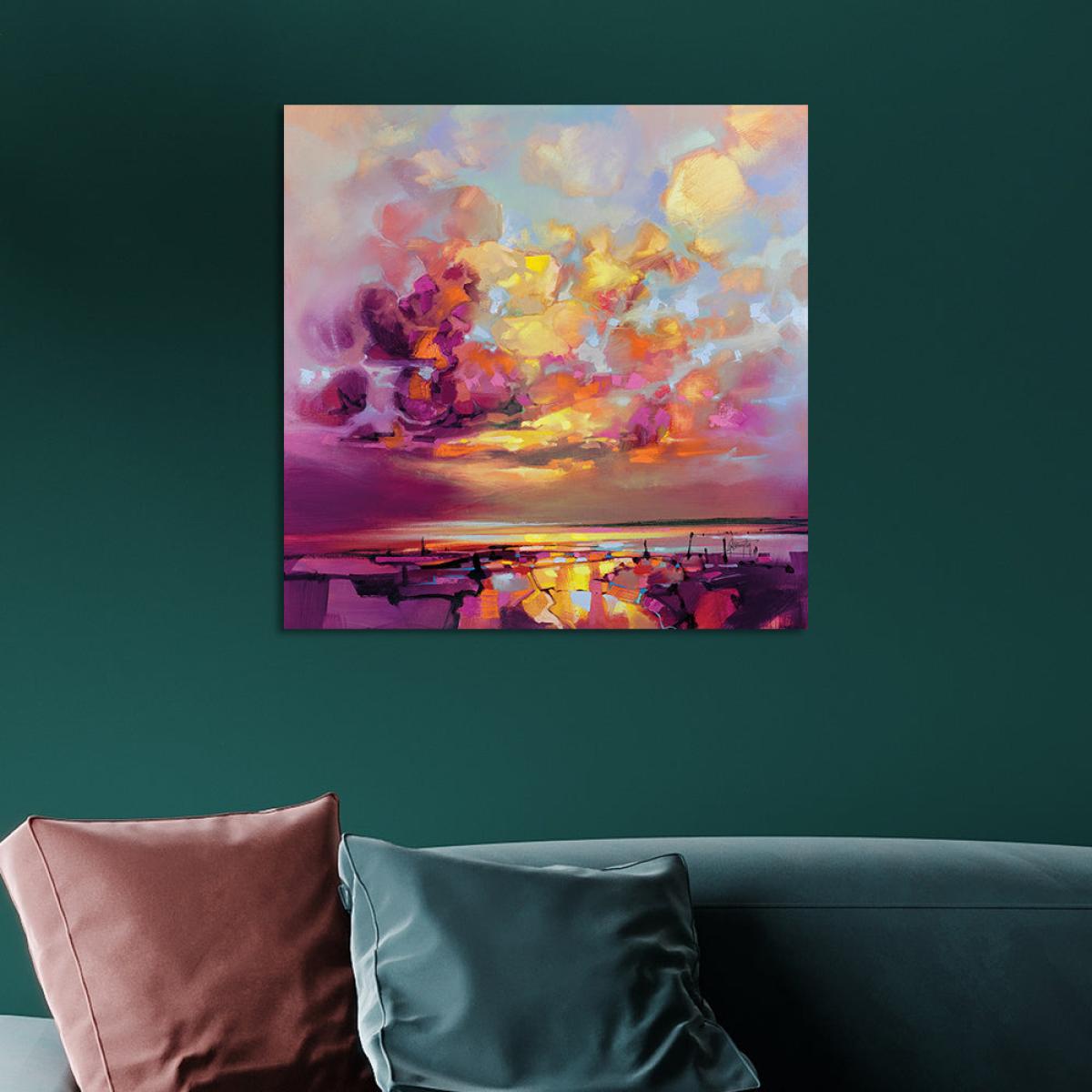 I love this sky-inspired piece for its vibrant and soothing colour palette, making it a versatile addition to a variety of interiors. It works particularly well in contemporary living rooms, bedrooms, or even a statement hallway where you want to create a calming yet energising focal point. To style it effectively, consider pairing with neutral or muted furnishings to allow the artwork to stand out, or incorporate colours from the piece into cushions, throws, or accessories for a cohesive look. Its substantial size (60x60) makes it ideal for wall spaces that need a bit of visual interest, and the abstract nature of the design suits both minimal and eclectic decor styles. Practical tip: hang it at eye level in a place where natural light highlights its colours to truly enhance its impact.