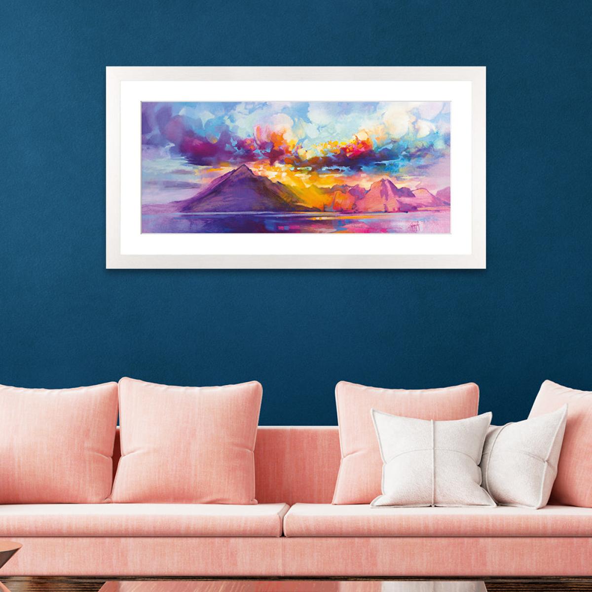 The Scott Naismith Cuillins Ridge framed art is a striking piece that works particularly well in modern, contemporary, or even minimalist interiors due to its bold landscape and vivid colours. I love the way it adds a splash of colour and a sense of depth, making it a fantastic focal point in a living room or a large hallway. Practical styling tips include pairing it with neutral walls and sleek furnishings to let the artwork stand out, or contrasting it against darker tones for a more dramatic effect. Its size makes it ideal for over a sofa or a sideboard, but remember to hang it at eye level for maximum visual impact. Overall, it’s a versatile piece that can elevate a space by adding colour, personality, and a touch of the outdoors.