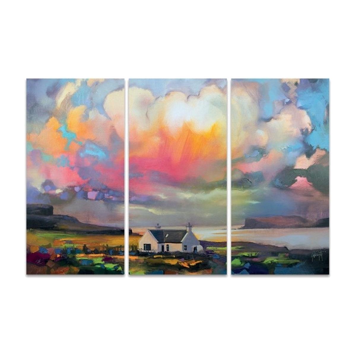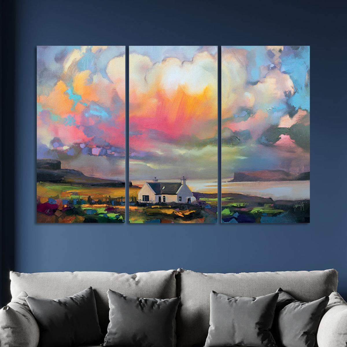 I love this canvas for its vibrant colour palette and expansive sky scene, which makes it a fantastic statement piece in both contemporary and rustic interiors. Its triptych format works well above a sofa or mantel, providing a sense of scale and drama without overwhelming smaller rooms. To style it effectively, consider pairing with neutral or muted furnishings to allow the artwork to stand out, but don’t shy away from bold accessories in similar hues for a co-ordinated look. It’s particularly suited to cosy living rooms, open-plan spaces, or even bedrooms where a touch of colour and atmosphere can elevate the overall aesthetic.