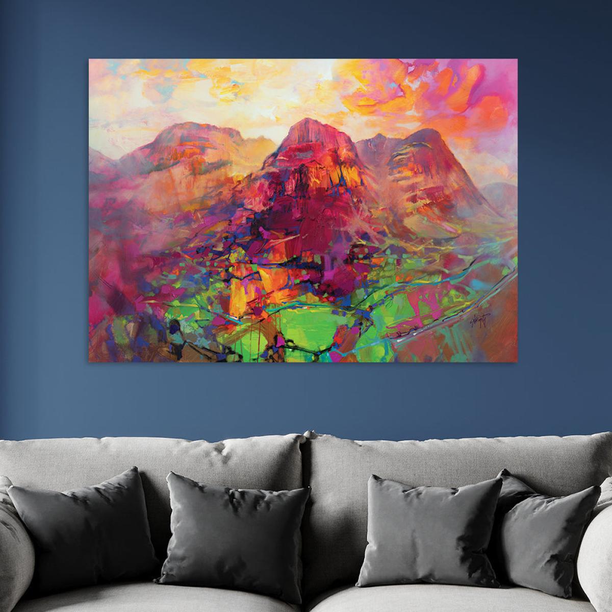 I love this Scott Naismith canvas for its bold, vibrant colours and dynamic landscape scene. It works particularly well in contemporary or eclectic interiors, where its expressive style can serve as a focal point. For practicality, it’s ideal for living rooms or offices where you want to add colour and energy without overwhelming the space. When styling, consider pairing it with neutral furnishings to let the artwork stand out, or echo colours from the piece in accessories like cushions or rugs for a cohesive look. Its large size makes it a statement piece, so hang it at eye level above a sofa or feature wall for maximum impact.