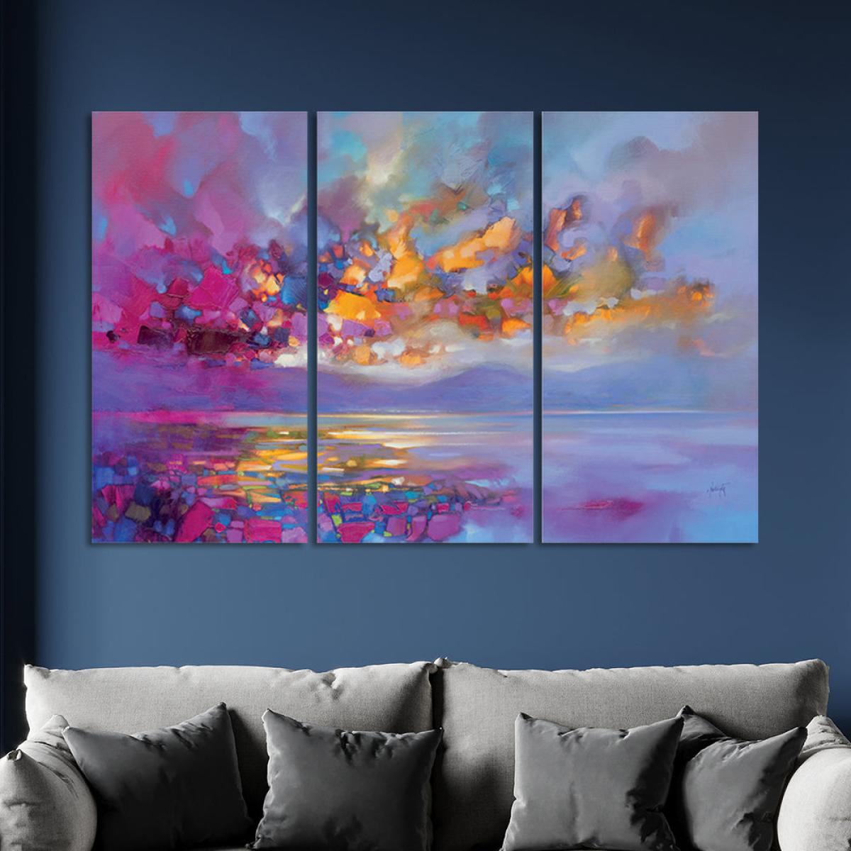 I love this one for its vibrant colour play and modern vibrancy. The Scott Naismith magenta refraction canvas is versatile enough to brighten up both contemporary and eclectic interiors, particularly in living rooms or bedrooms where a splash of colour can energise the space. It's a great statement piece, especially when paired with neutral furnishings, allowing the artwork to truly stand out. For practical styling, consider mounting it above a sofa or bed and keep other accents simple-think minimal frames and understated accessories-to let the artwork be the focal point. It’s also worth experimenting with balanced lighting to highlight the colour nuances and textures within the piece for maximum effect.