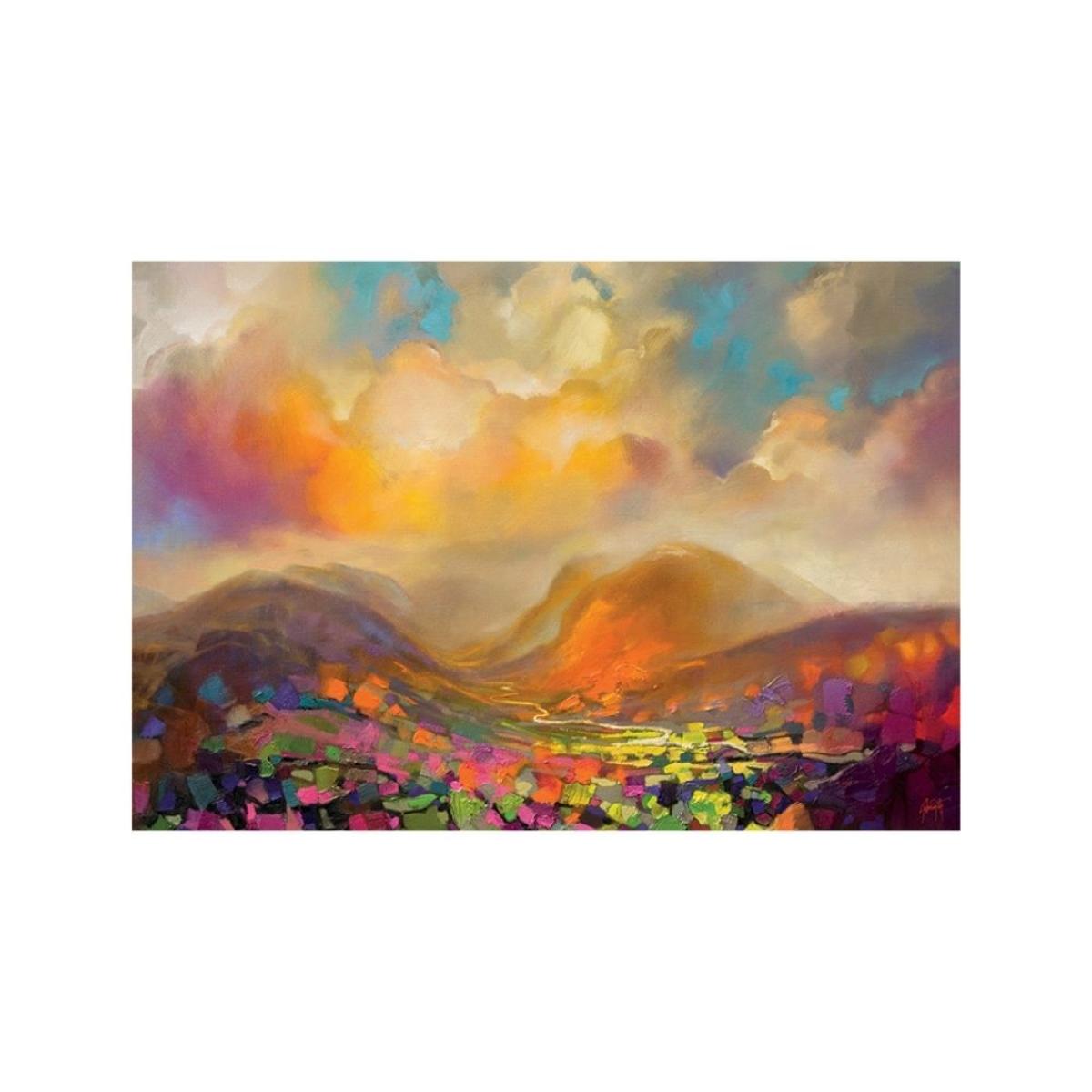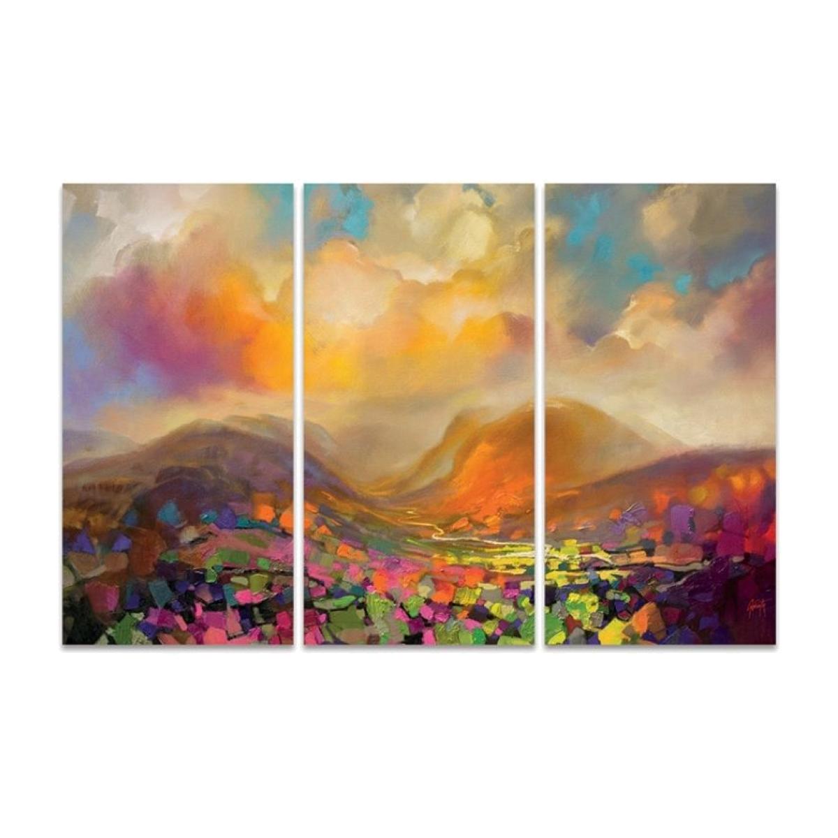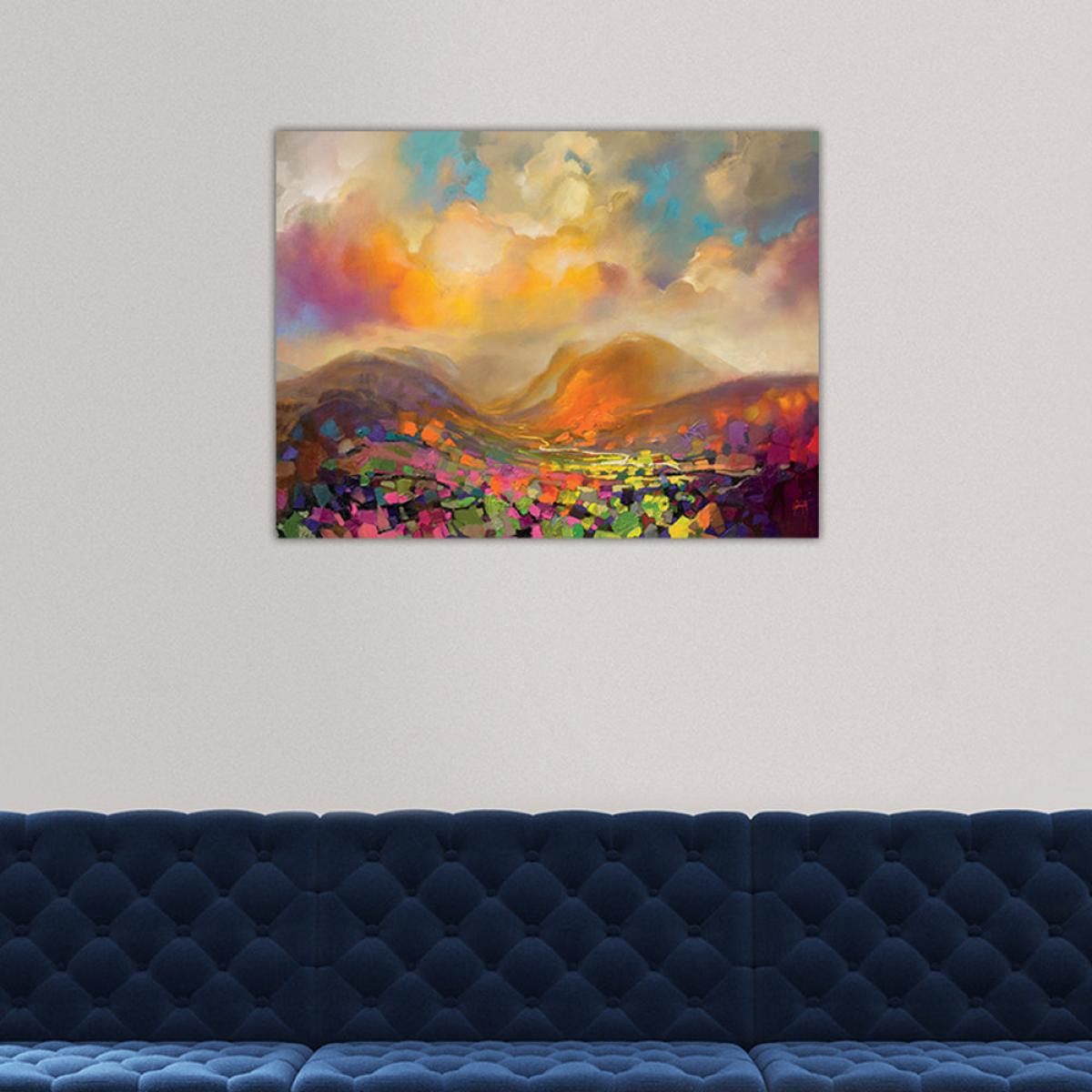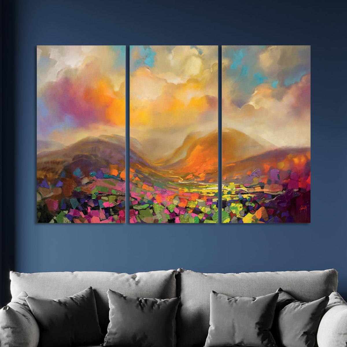 The Scott Naismith Nevis Range canvas is a striking piece that works well in contemporary and eclectic interiors, adding colour and energy to a space. I love its vibrant palette and multi-panel layout, which creates a dynamic focal point in living rooms or open-plan spaces. It's particularly effective when paired with neutral walls and simple furnishings, allowing the artwork to stand out without overwhelming the room. Practical styling tips include positioning it above a sofa or sideboard, and complementing it with accessories in similar hues to create a cohesive look. Overall, it’s a versatile piece that can enhance the character of a variety of interiors.