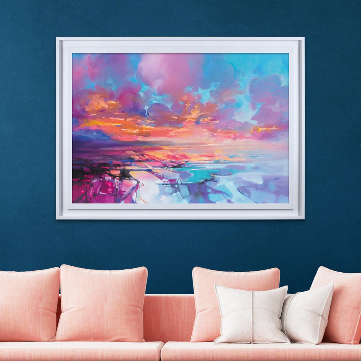 This piece is a fantastic statement for contemporary interiors, especially those with a clean, minimalist aesthetic. I love how the vibrant colours and dynamic composition of the sky bring energy and a sense of scale to a space - the 70 x 100 size makes it ideal for a feature wall. It works well in living rooms or bedrooms with neutral palettes, where it can serve as a focal point, or in offices to stimulate creativity. When styling, consider pairing it with sleek, understated frames or even a simple wall mount to keep the focus on the artwork itself. Pair it with minimal accessories to avoid overwhelming the space and let the colours and mood of the sky do the work.
