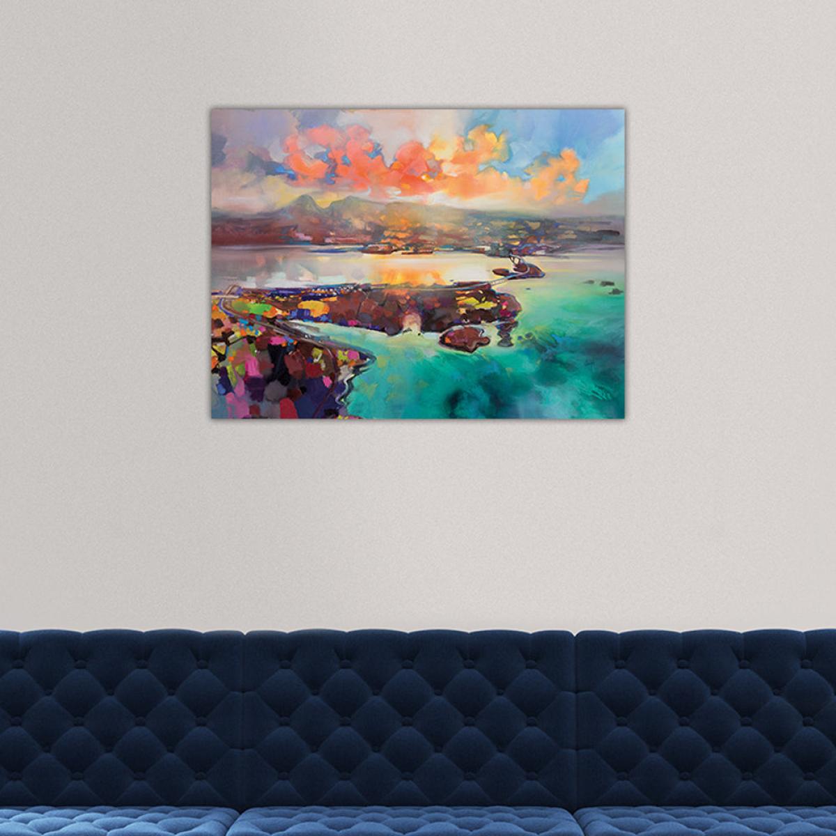 I love this Skye Bridge canvas for its vibrant, painterly depiction of a well-known Scottish landscape, which adds colour and personality to various interiors. It works particularly well in contemporary or eclectic spaces where a splash of colour can serve as a focal point. To style it effectively, consider pairing it with neutral furnishings to let the artwork stand out, or coordinate with accessories that pick up some of its tones for a cohesive look. Given its size, it’s best suited above a sofa or a large empty wall, and should be hung at eye level for maximum impact. This piece is versatile enough to suit living rooms, studies, or even bedrooms, adding a lively, scenic touch whatever the space.