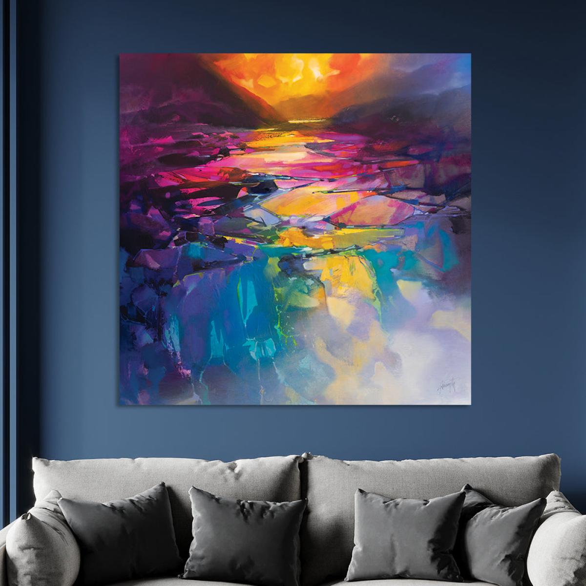 The Scott Naismith Spectrum Valley Canvas is a striking piece that works well in contemporary or eclectic interiors, adding a bold splash of colour and energy to any room. I love it because of its vibrant palette and dynamic composition, which can serve as a focal point above a neutral sofa or dining area. When styling with this artwork, keep the surrounding decor relatively understated to allow the piece to shine-think simple furnishings and minimal accessories. For added impact, consider framing it with sleek, modern edges or hanging it unframed for a more art-world vibe. Its 120x120 size makes it versatile for larger walls, making it perfect for living rooms or feature walls where you want a statement art piece.