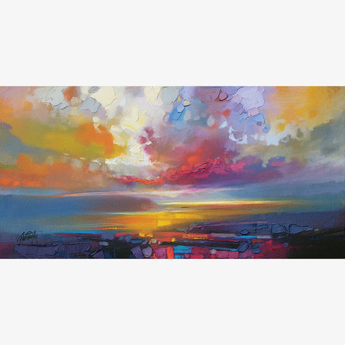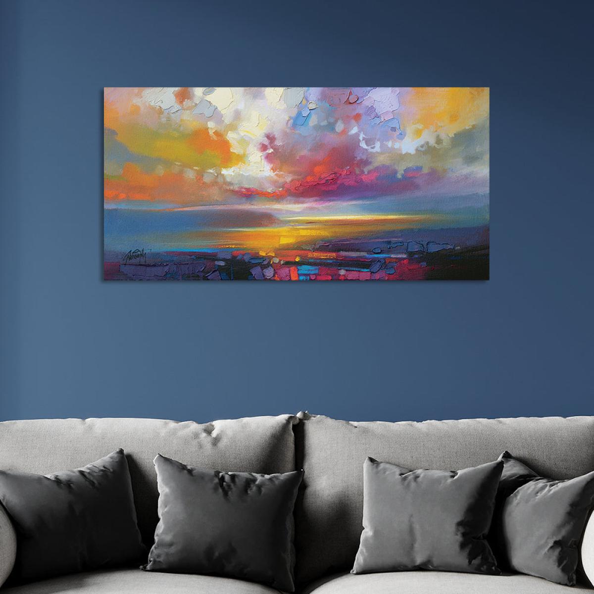 I love the Scott Naismith Uig Clouds canvas for its vibrant, yet tranquil colour palette and its large scale, making it a statement piece in any space. It works especially well in modern or contemporary interiors, adding a splash of colour and a sense of openness. To style it effectively, consider pairing it with neutral furnishings and minimalist accessories to let the artwork stand out. Its rectangular shape suits elongated wall spaces, like above a sofa or a console table, and it provides a great opportunity to inject personality into living rooms or bedrooms. Practical tips include ensuring proper lighting to enhance the colours and placing it at eye level for maximum impact.