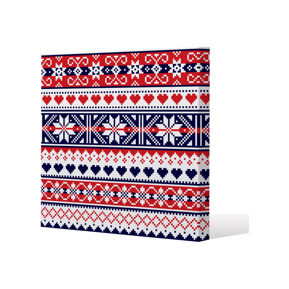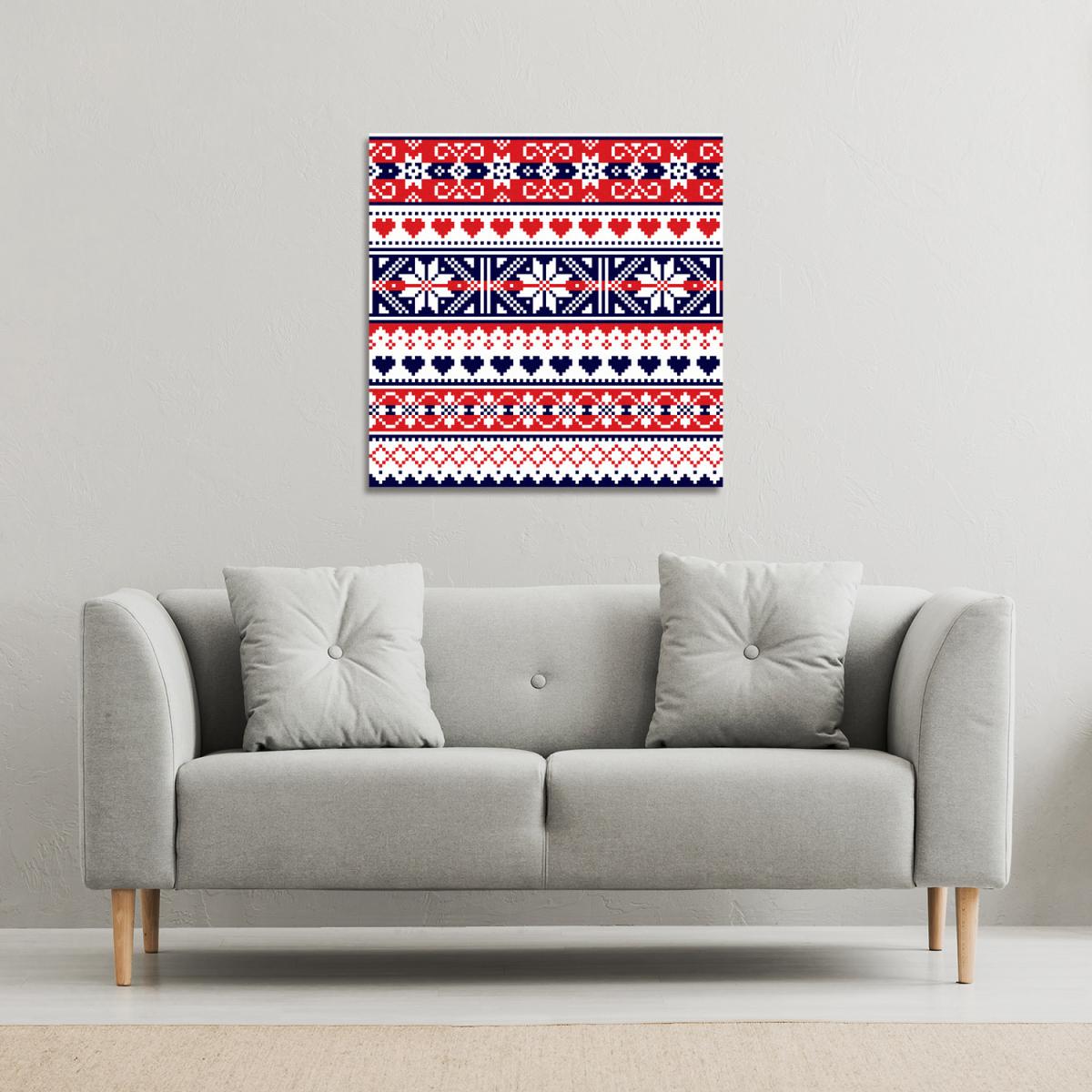 The Scottish Fair Gallery Canvas - Red is a bold and vibrant piece that works beautifully in contemporary or eclectic interiors. I love it for its striking colour palette and pattern, which can instantly add warmth and personality to a space. It pairs well with neutral walls to create a focal point or can be mixed with other Red and navy accents for a cohesive look. Practical styling tips include layering it with other textured pieces, such as knitted throws or woven baskets, to enhance its Scandinavian-inspired charm. For a more modern feel, hang it above a simple console or sideboard to keep the artwork as the main statement.