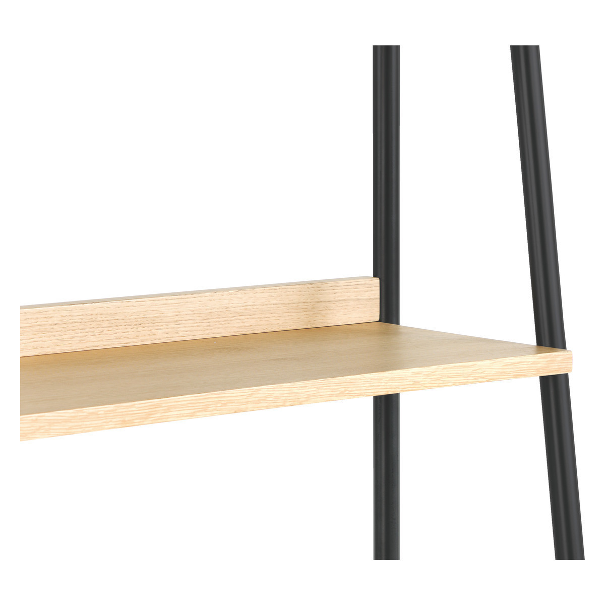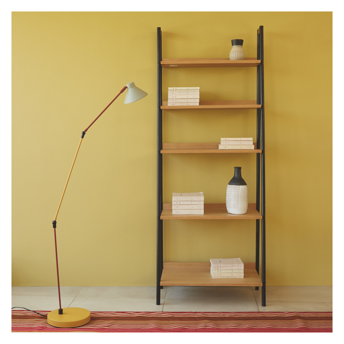 The Scout oak 5 shelf bookcase with black frame is a streamlined design that offers storage and display space in the home office or living room.;Combining oak veneer with a sturdy, powder-coated frame, the bookcase's shelves vary in depth, allowing it accommodate larger books and decorative objects.;Designed in house and exclusive to Habitat, the bookcase is part of the Scout range, which includes a dining table and desk.