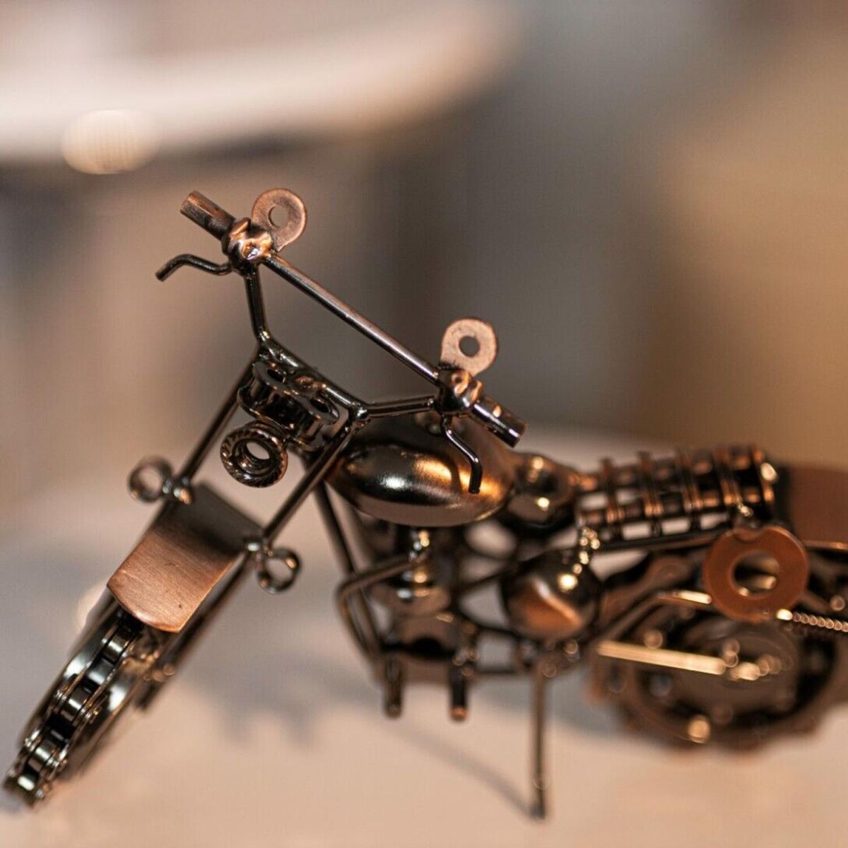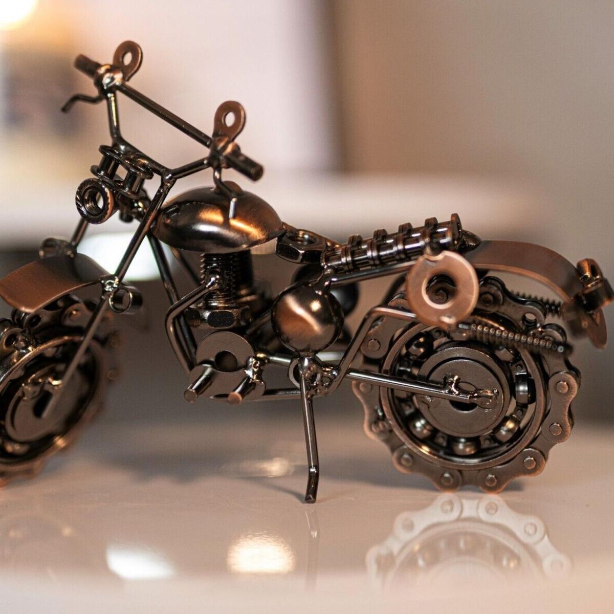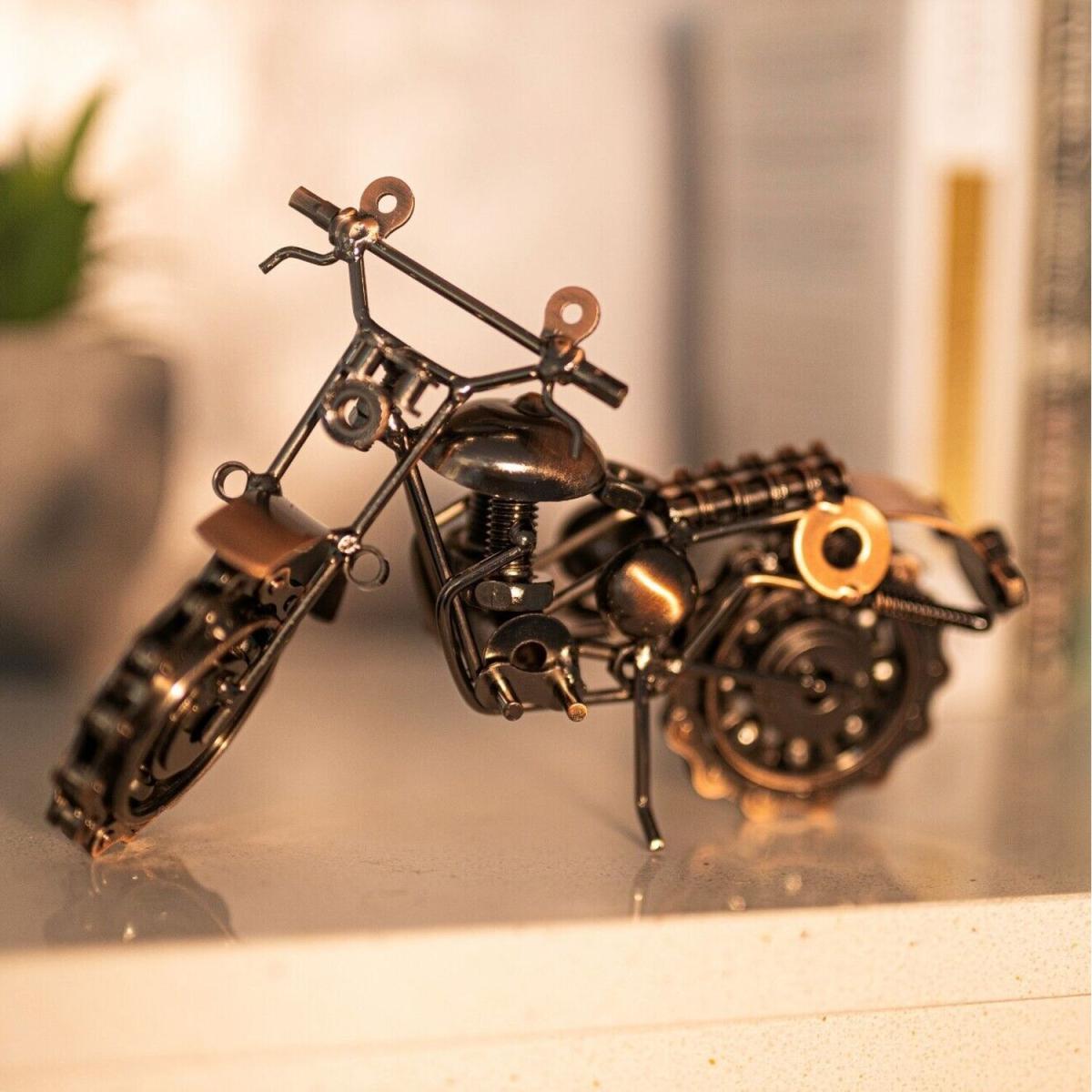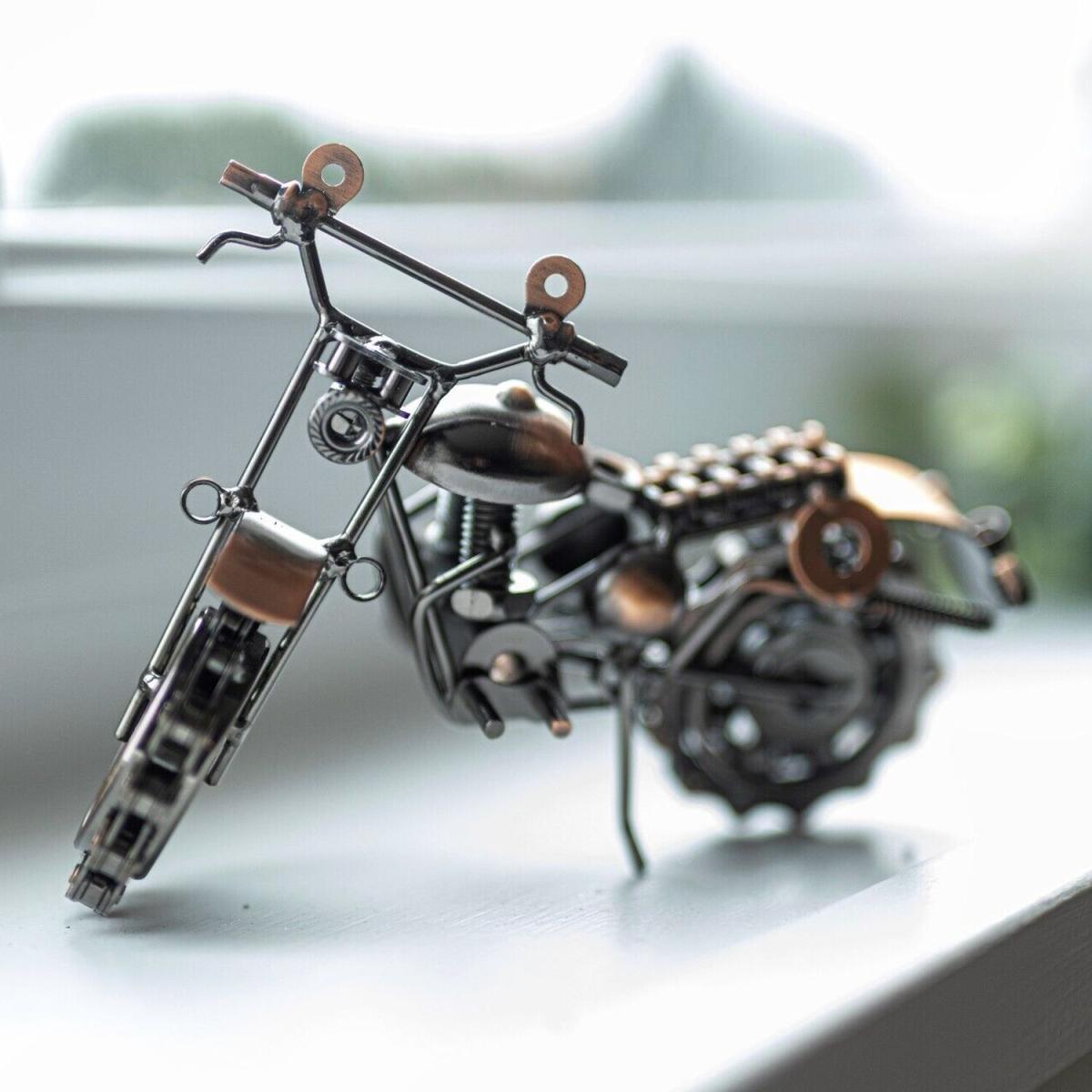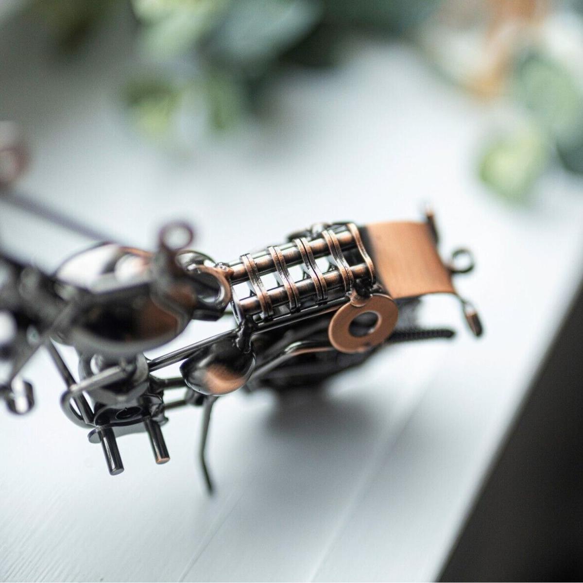 These fantastic sculptures are carefully and complicatedly made from metal with a bronze/copper finish. All wheels are moveable and each sculpture is finished in high detail. These are perfect for anyone who loves cars and bikes. 100% handcrafted, brand new and will last for a long time due to the plating process involved in creation. Each of our vehicles are made from reused pieces of metal and nuts and bolts making each one unique. These novelty metal vehicles would make a great gift for the man in your life or any petrol head. These stunning desk sculptures are made from metal and are finished in a vintage bronze effect.