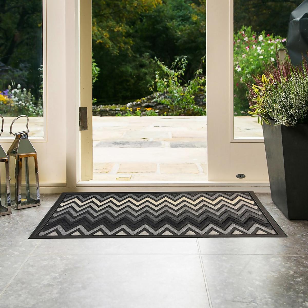 This indoor/outdoor doormat is perfect for any home. The heavy duty rubber base aids stability and keeps the mat flat whilst the nylon pile absorbs any excess moisture preventing it from entering the home. The pile is crush resistant so it will not go flat and its also UV stable so will not fade in sunlight. It's the mat that looks brand new day after day.