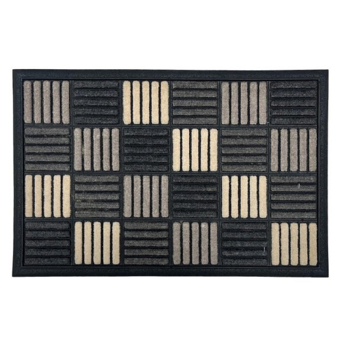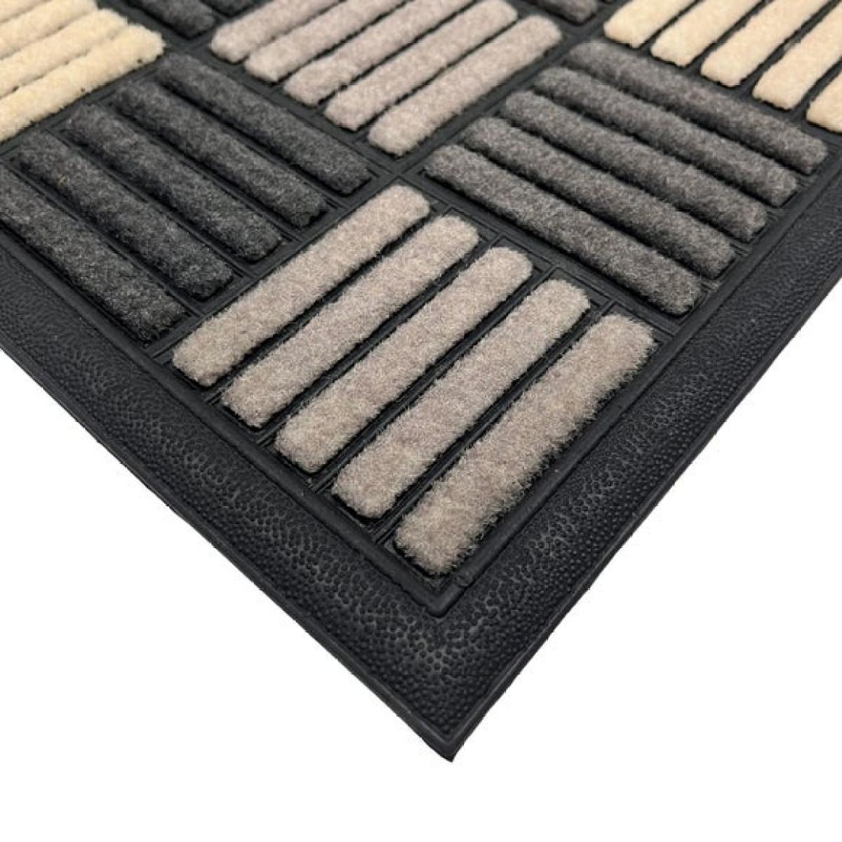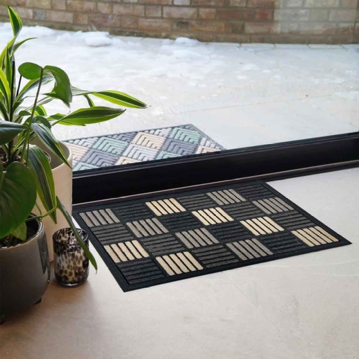 * Anti-slip backing * Suitable for outdoor use * Traditional striped in squares design Scrapes the dirt and absorbs the moisture, this square and striped doormat is ideal for any home. It can be placed inside or outside under shelter and the recycled nylon pile quickly absorbs excess moisture and dirt and helps prevent it from entering your home. The pile is also fade resistant to will stay looking newer for longer and the durable rubber base helps to keep the mat in place.**Please note:**Moisture, sunlight, heat and cleaning products may cause discolouration to your flooring therefore we recommend that you check with your flooring manufacturer for the suitability of using rubber backed mats in your home. We also recommend regularly lifting mats to allow the floor underneath to be cleaned and aired and not using on light coloured and vinyl flooring.