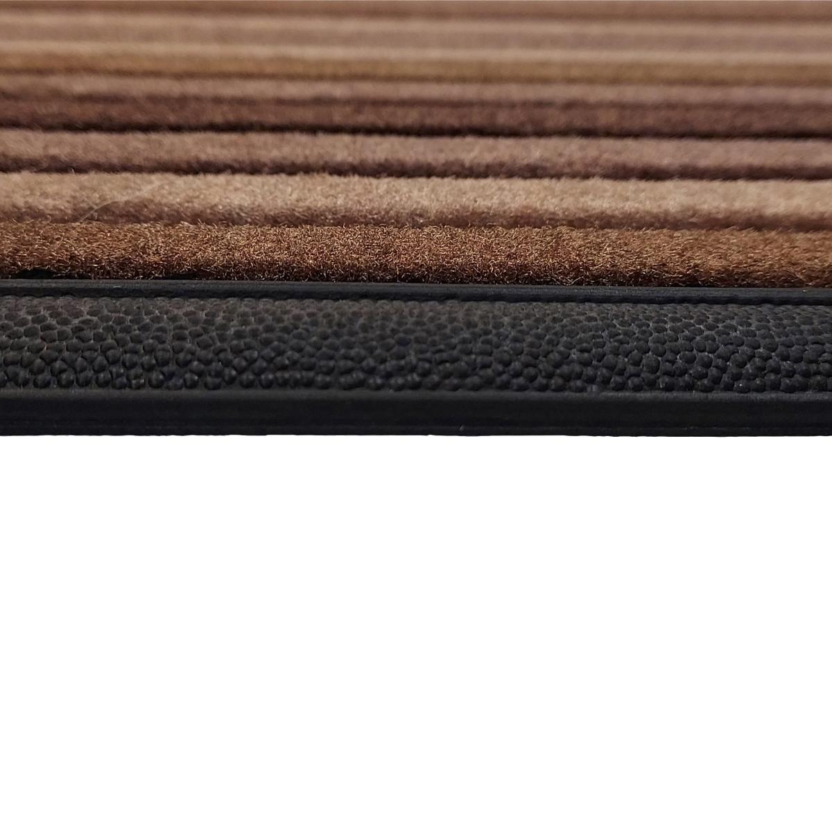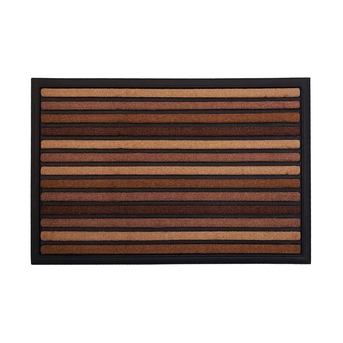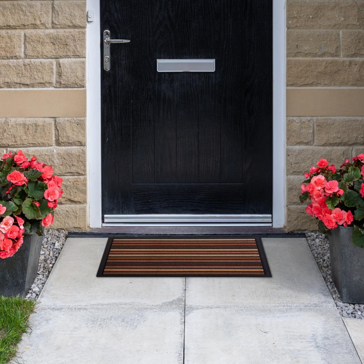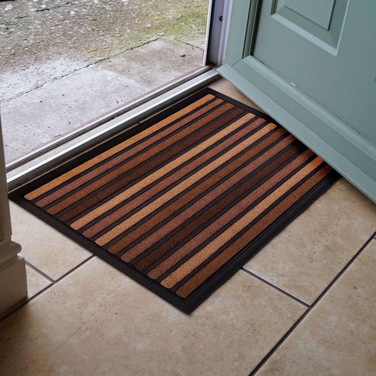 * Anti-slip backing* Suitable for outdoor use* Traditional striped design Scrapes the dirt and absorbs the moisture, this striped doormat is ideal for any home. It can be placed inside or outside under shelter and the recycled nylon pile quickly absorbs excess moisture and dirt and helps prevent it from entering your home. The pile is also fade resistant to will stay looking newer for longer and the durable rubber base helps to keep the mat in place.**Please note:**Moisture, sunlight, heat and cleaning products may cause discolouration to your flooring therefore we recommend that you check with your flooring manufacturer for the suitability of using rubber backed mats in your home. We also recommend regularly lifting mats to allow the floor underneath to be cleaned and aired and not using on light coloured and vinyl flooring.