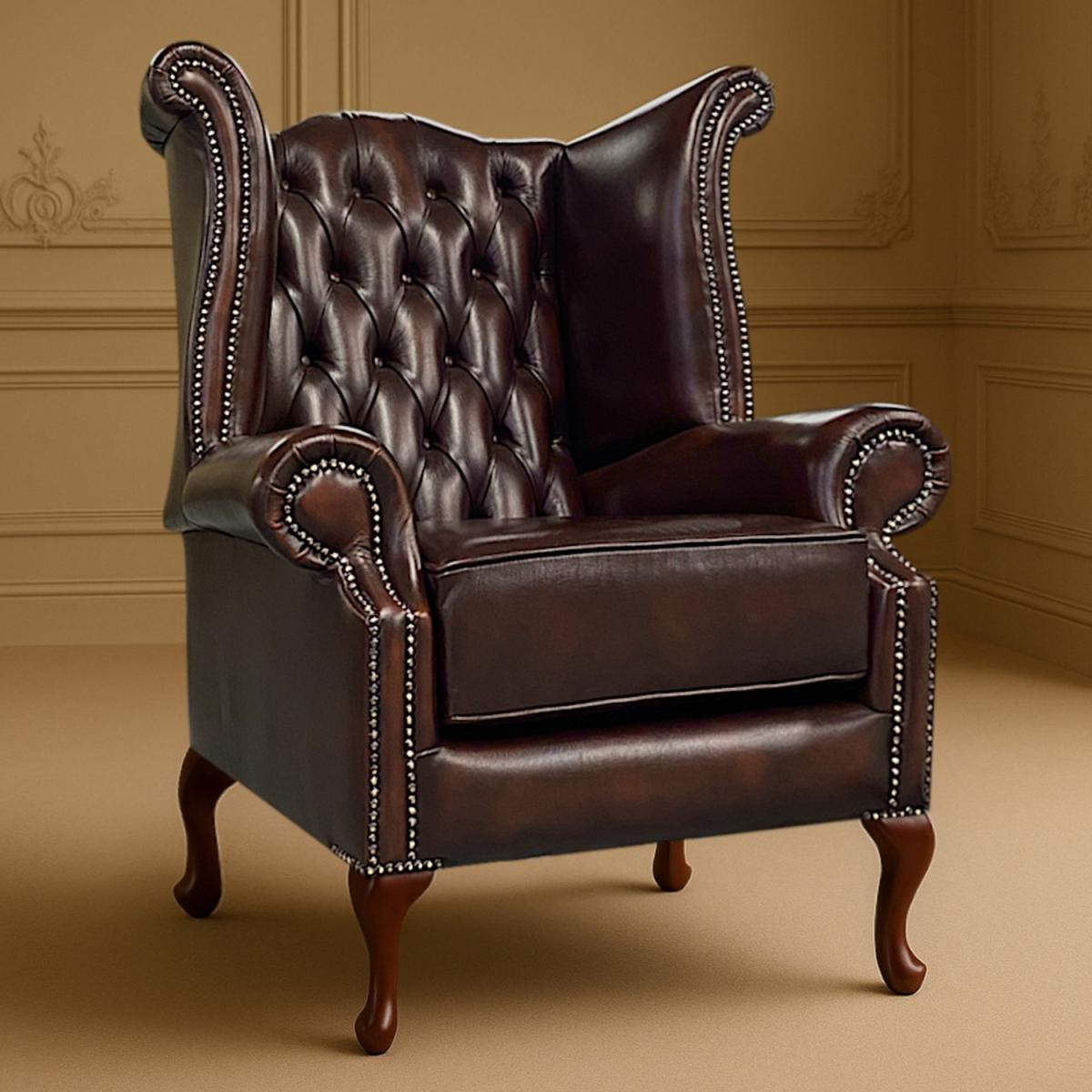 The Queen Anne Chesterfield Chair in premium leather is the epitome of British tradition and timeless luxury. Handcrafted in the UK, it combines iconic Chesterfield tufting with the elegant curves of a Queen Anne silhouette. The arched scrolled arms, button-tufted winged backrest, and hand-applied stud detailing create a refined, distinguished look. Upholstered in premium old vintage leather, it offers both durability and richness. Deep foam-filled cushions and a generously padded seat provide exceptional comfort while maintaining posture-friendly support. The design is completed with polished Queen Anne cabriole legs, enhancing both stability and elegance. Crafted with meticulous attention to detail, this chair is not only a seat but a piece of heritage furniture, designed to elevate interiors with sophistication. Complete with a 1-year manufacturers warranty, it is an investment in both comfort and enduring style. Dimensions, 42" Height, 36.5" Width, 28" Depth. Please note, this product is made from Natural Grain Leather, the highest quality, naturally this products leather fabric will show different shades and tones of the colour throughout the product, as seen in the images.