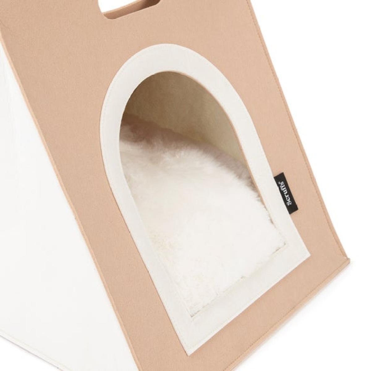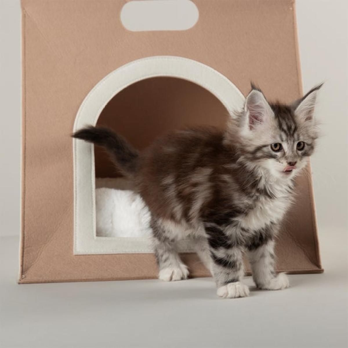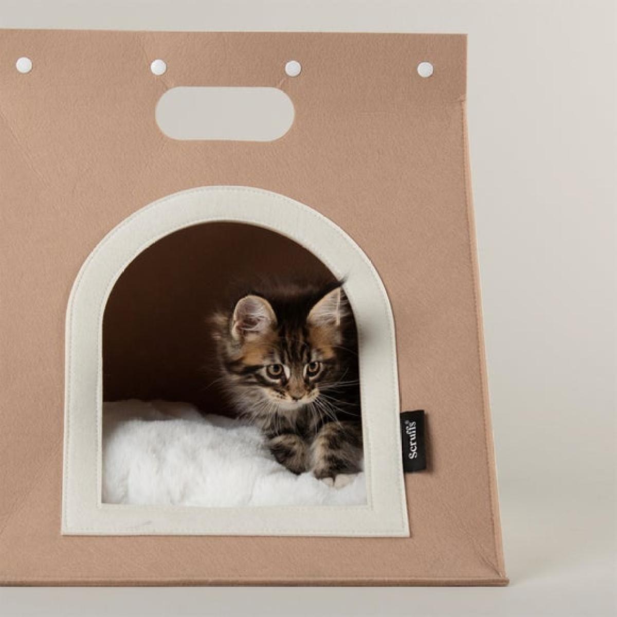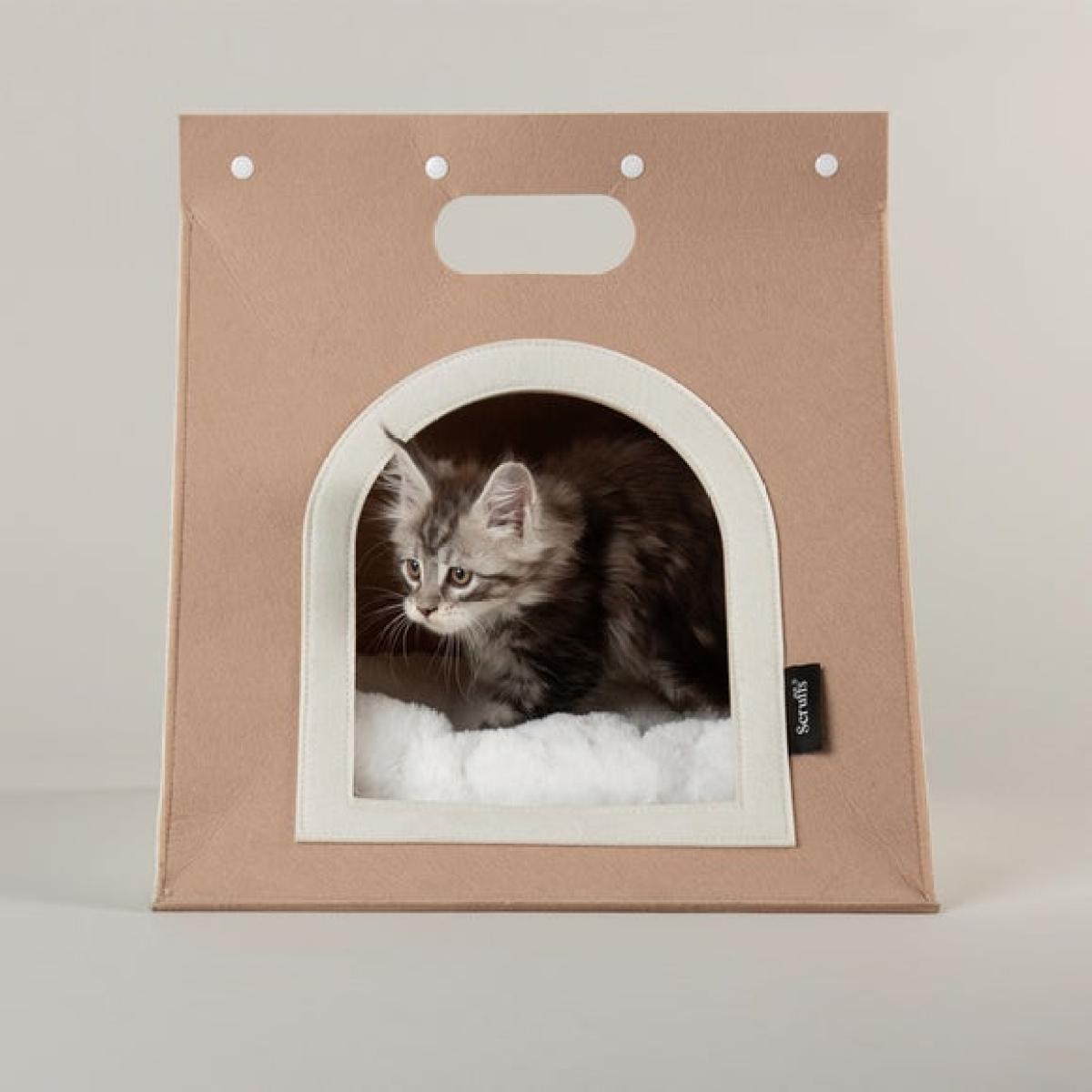 I love this cat bed because of its contemporary yet cosy design. The felt material adds a soft, tactile element that suits modern interiors, especially those with minimalist or Scandinavian themes. It works well in spaces that border functionality and style, like living rooms or bedrooms that feature neutral tones and natural textures. Practical styling tips include placing it on a low shelf or beside a window to encourage your feline to observe their surroundings while being comfortably enclosed. The neutral colour means it can blend seamlessly with a variety of colour palettes, and positioning it in a spot where your cat feels safe can make it a charming and functional addition to your home.
