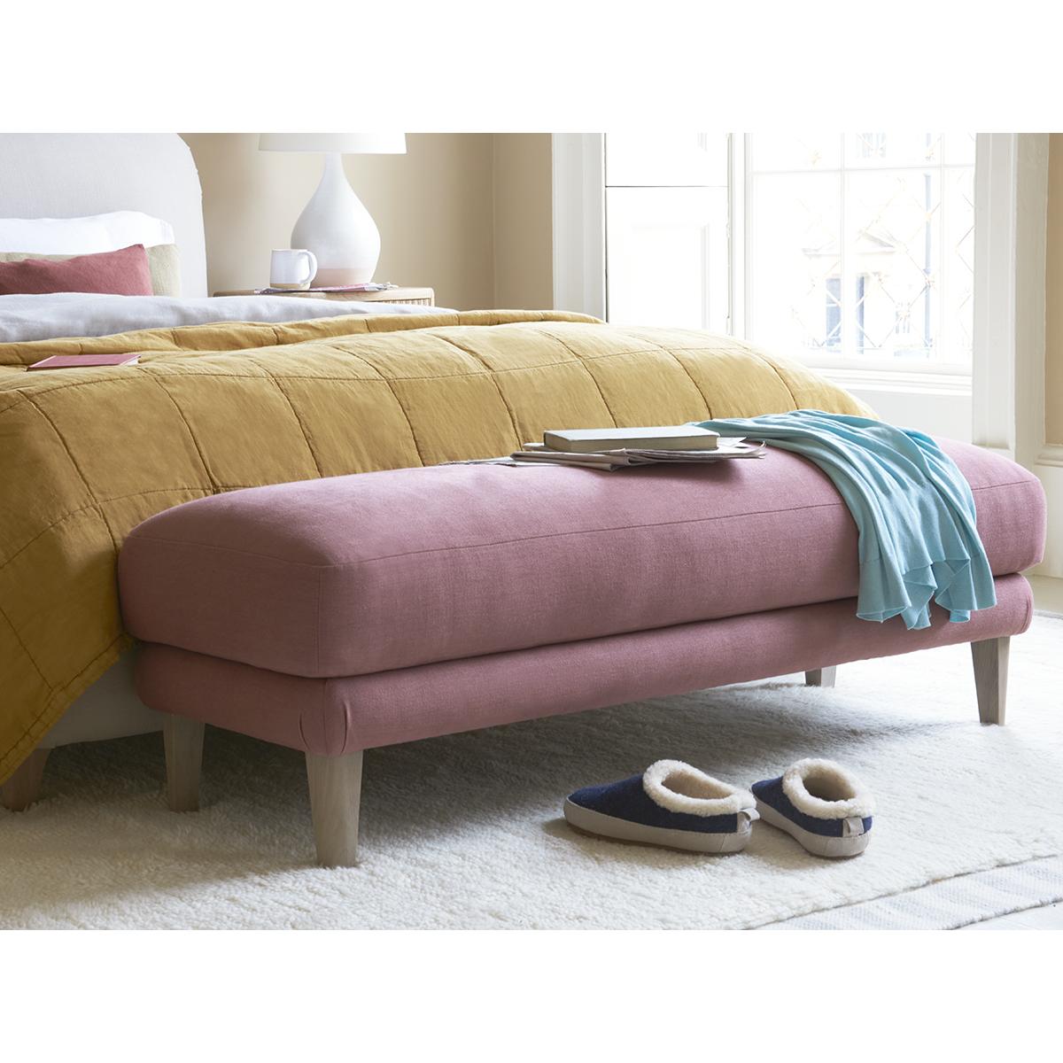 I love this ottoman bench for its clean, versatile silhouette and soft colour palette, making it an adaptable piece for various interiors. It works particularly well in both contemporary and mid-century styled spaces, acting as a practical footrest, extra seating, or even a centrepiece when styled with a tray or decorative accessories. Practical styling tips include placing it at the foot of a bed for a functional yet stylish addition, or using it in an entryway for a comfortable place to sit while putting on shoes. Its understated design allows it to blend seamlessly with various colour schemes, while the soft fabric adds a touch of warmth to the room.