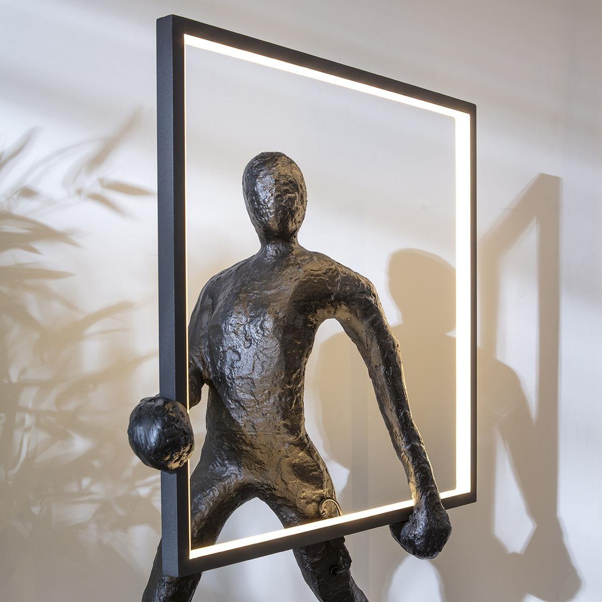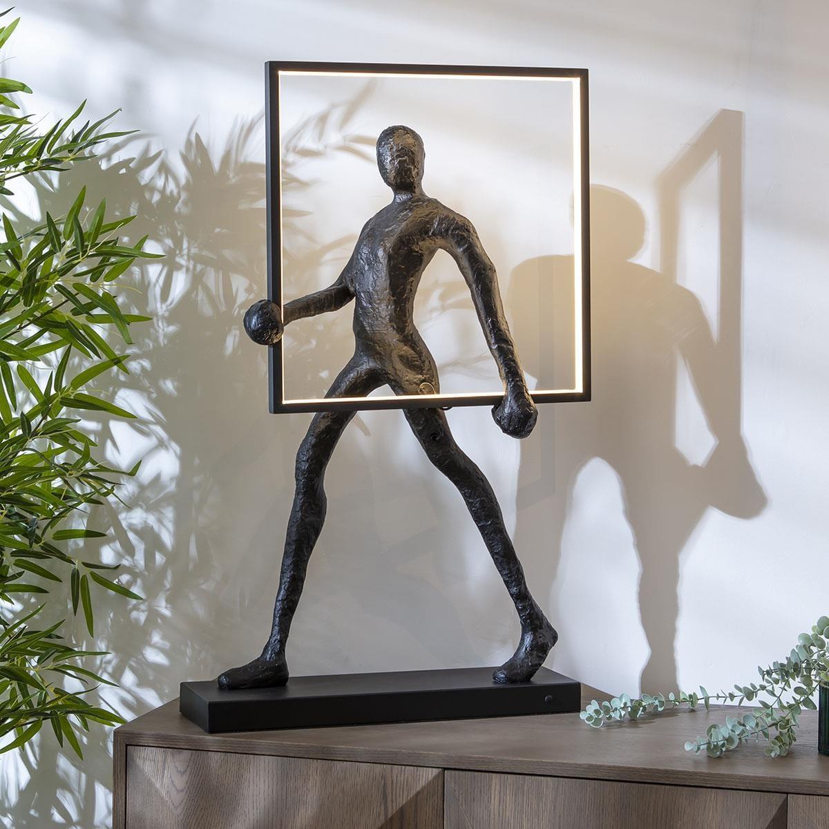 Illuminate your space with this unusual black table lamp, featuring a bold and modern design. At 50cm wide and 92cm tall, it showcases a black figure holding a glowing square frame. Perfect as a black bedside lamp or statement piece, it uses an LED strip emitting 3000. K warm light. This modern black table lamp is a true conversation starter. The sculptural black figure and luminous square frame create a striking balance of form and function, making it ideal for those seeking an unusual table lamp that elevates any interior. Crafted from high-quality resin, the lamp ensures durability without compromising on style. The matte black finish enhances its artistic appeal, making it a standout addition to contemporary decor. The lamp features an LED light strip, providing a soothing 3000. K warm light thats perfect for cosy evenings. Whether used as a black bedside lamp or focal point, its soft glow adds warmth to any room. W50cm D50cm H92cm Black Resin LED 3000. K