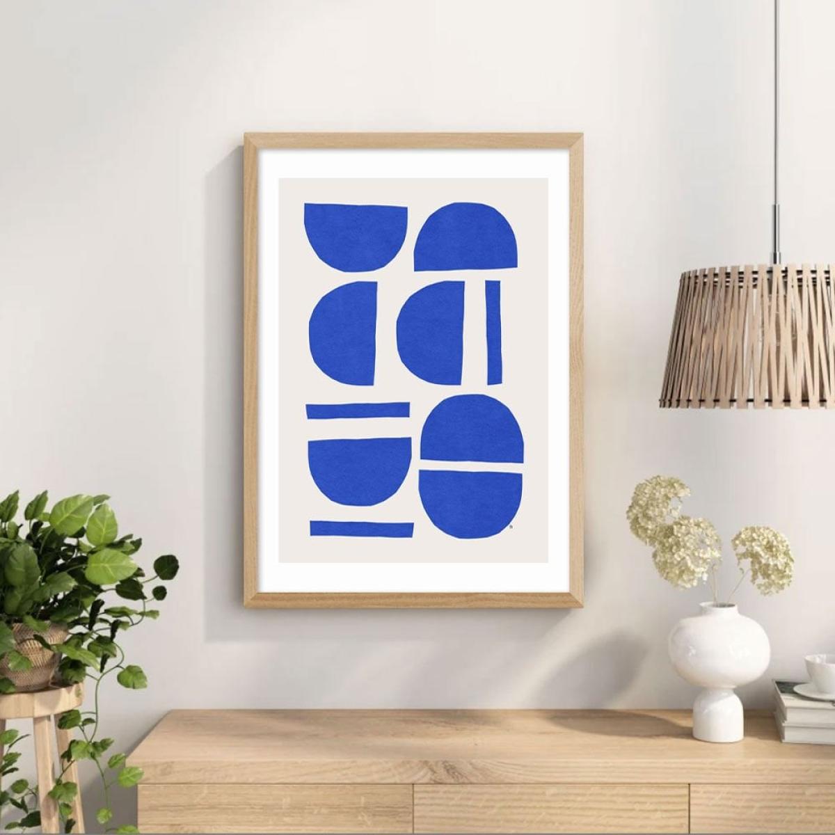 This blue abstract print is a versatile piece that works particularly well in modern or minimalist interiors, adding a pop of colour without overwhelming the space. I love how its bold yet simple shapes can serve as a focal point on neutral walls or complement a colour scheme with similar tones. It fits effortlessly into a variety of settings-from living rooms to home offices-especially when paired with natural materials like wood or neutral textiles. Practical styling tips include mounting it within a light oak or natural wood frame to echo its colours, and placing it above a console or sofa to balance the composition. Make sure to keep surrounding accessories understated to allow the artwork to really shine.